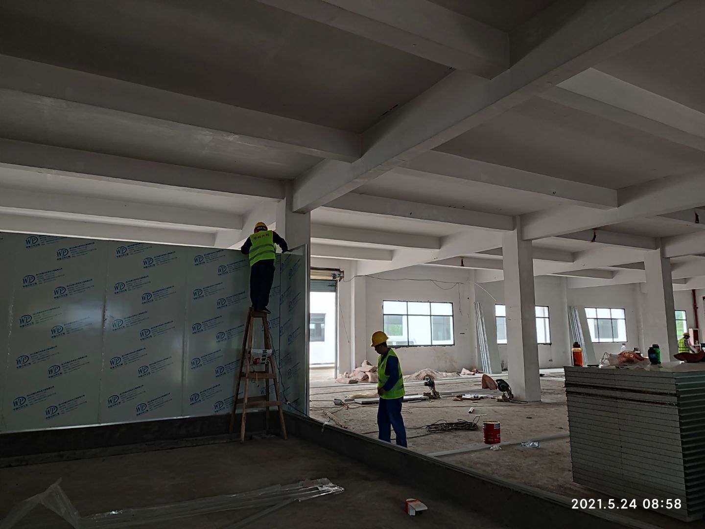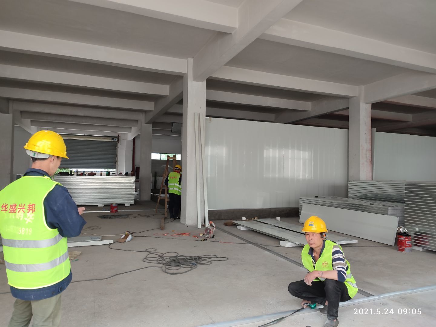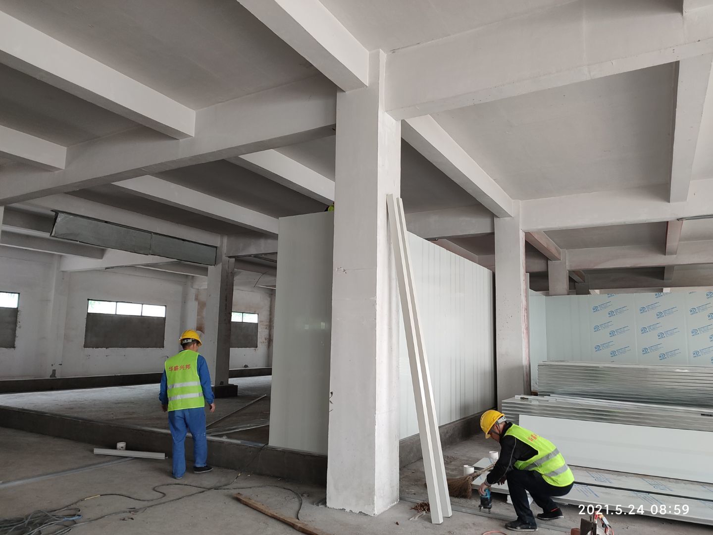 1,擋水墻完成; 2,固化地坪打磨完成近一半; 3,隔斷彩板到貨三分之一。