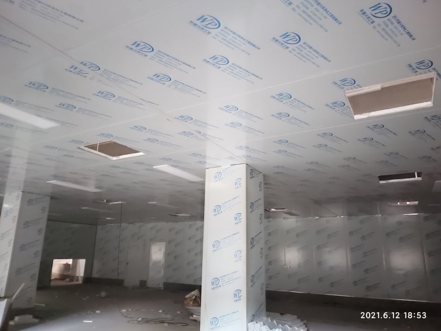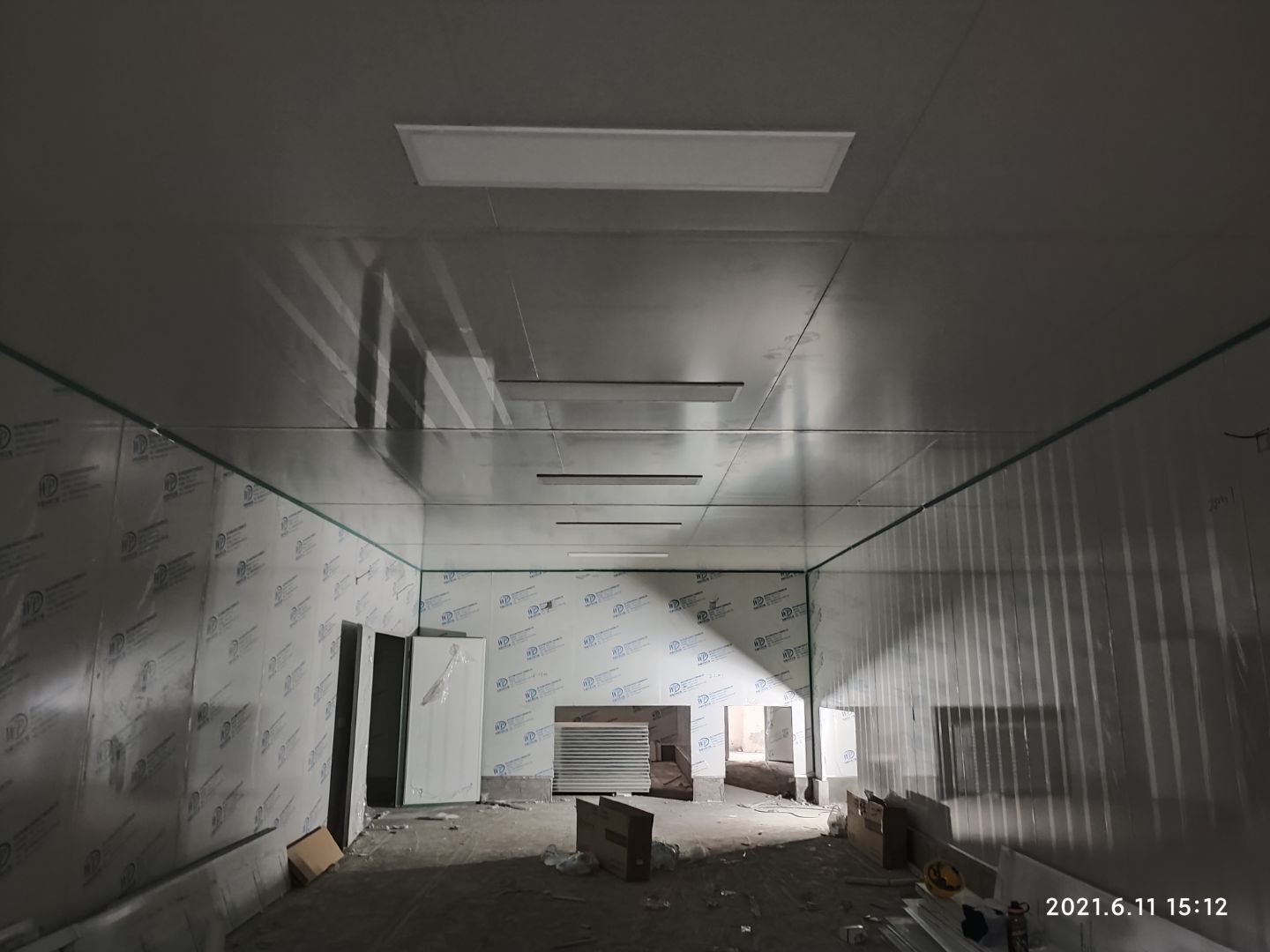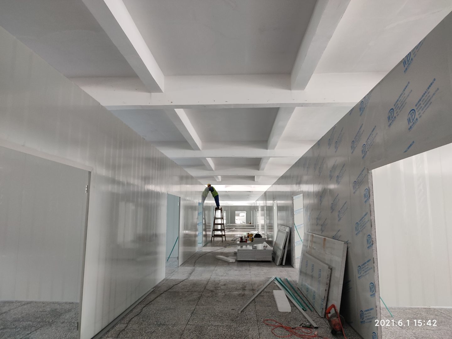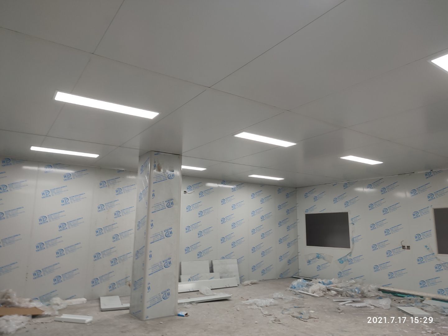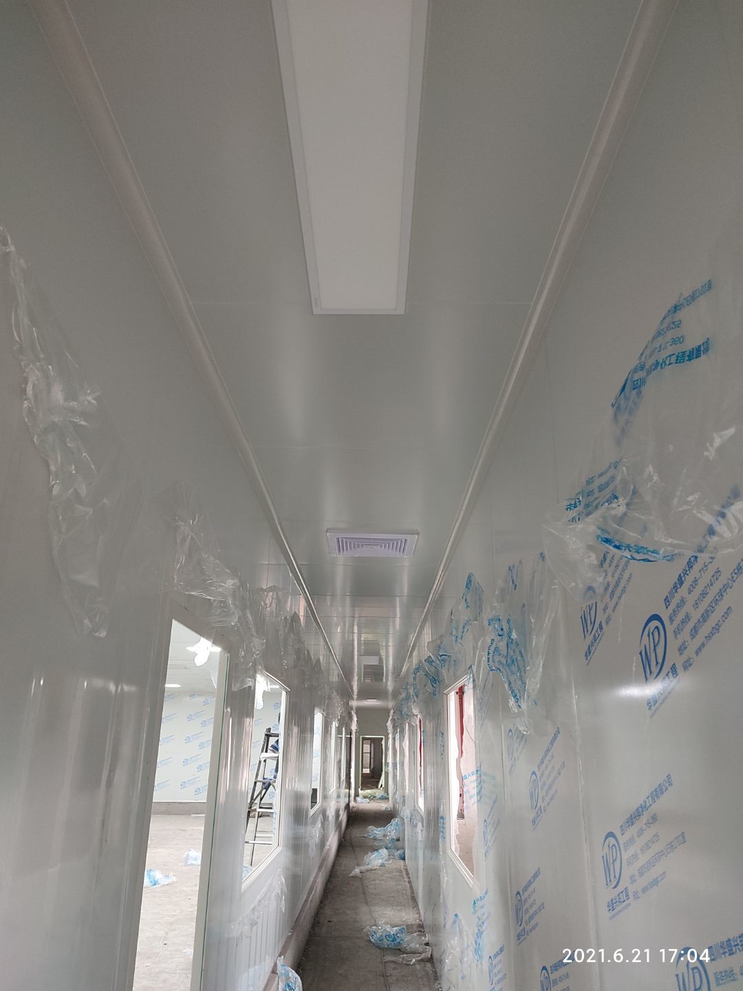 1.頂板撕膜打膠完成35% 2.彩鋼板區(qū)域換氣扇安裝完成70% 3.門鎖安裝完成70%