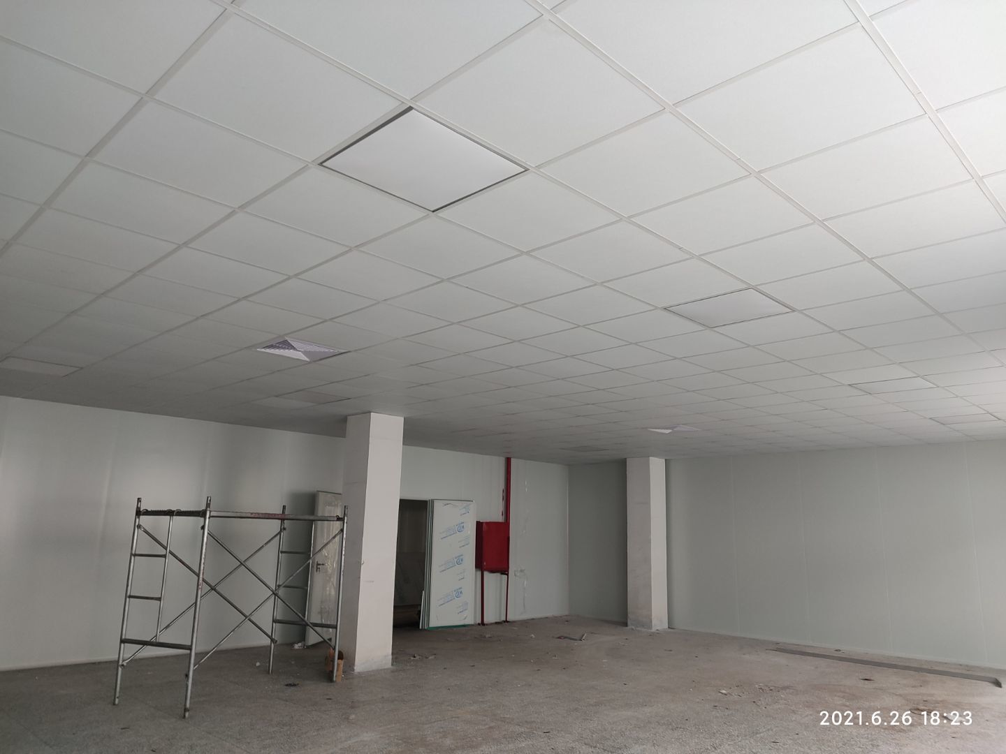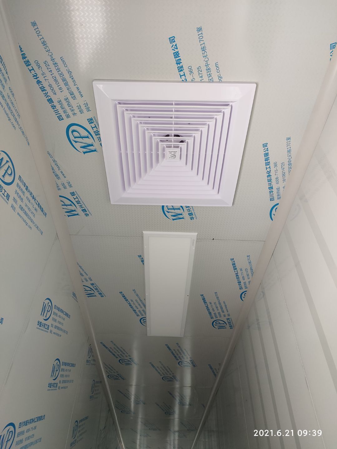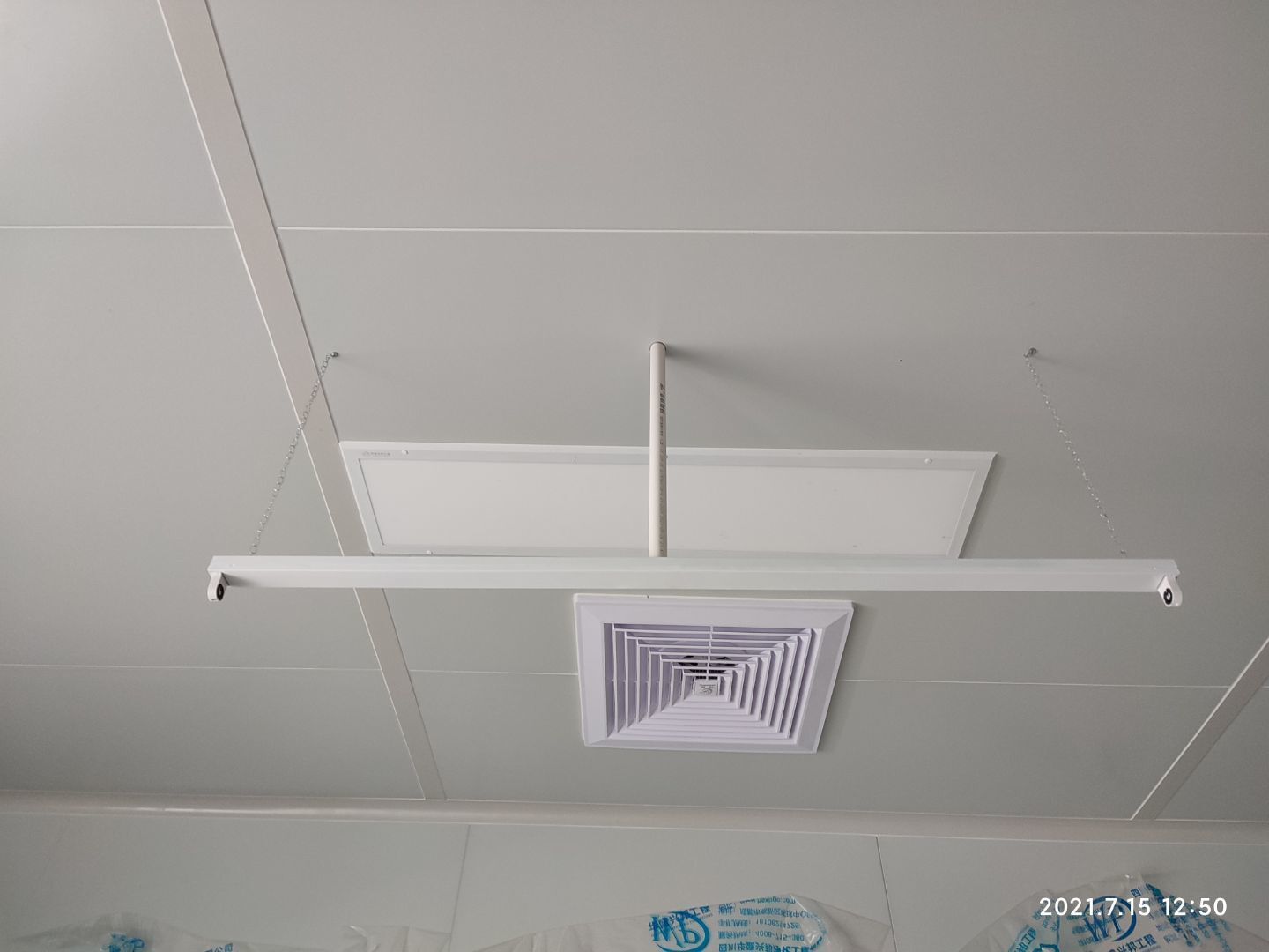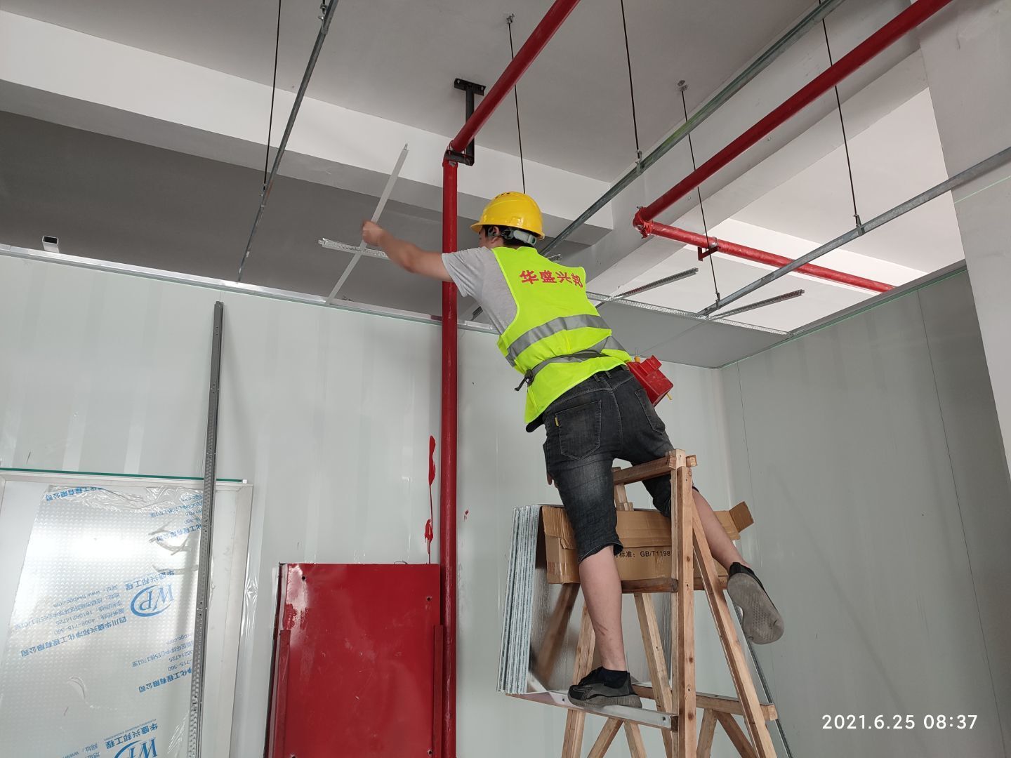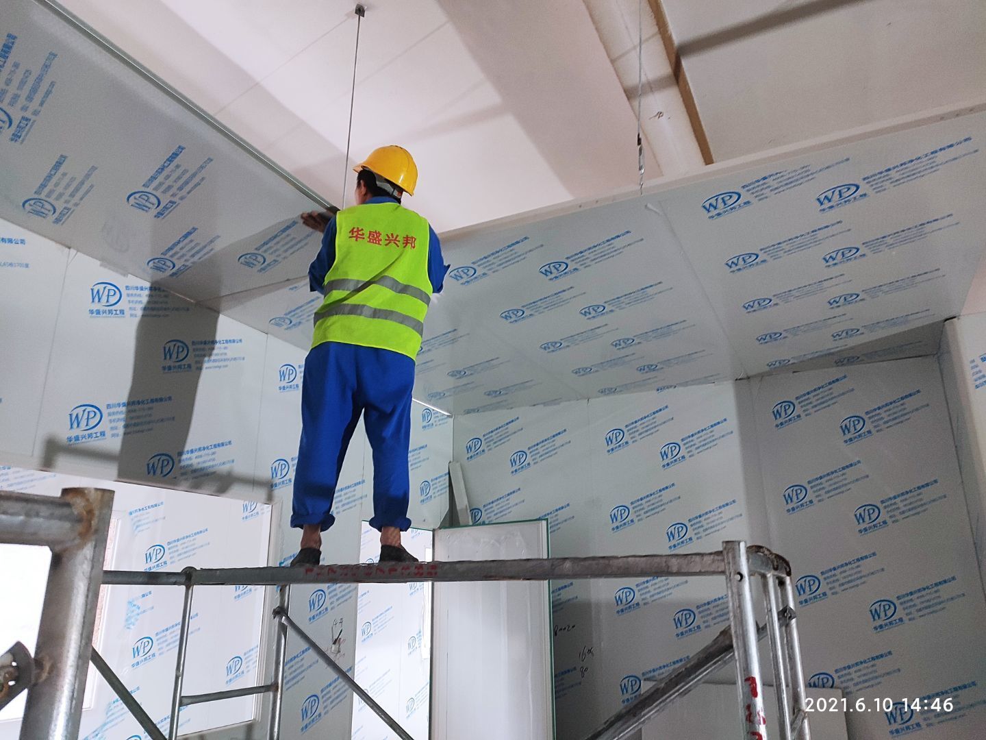1.頂板撕膜打膠完成35% 2.彩鋼板區(qū)域換氣扇安裝完成70% 3.門鎖安裝完成70%