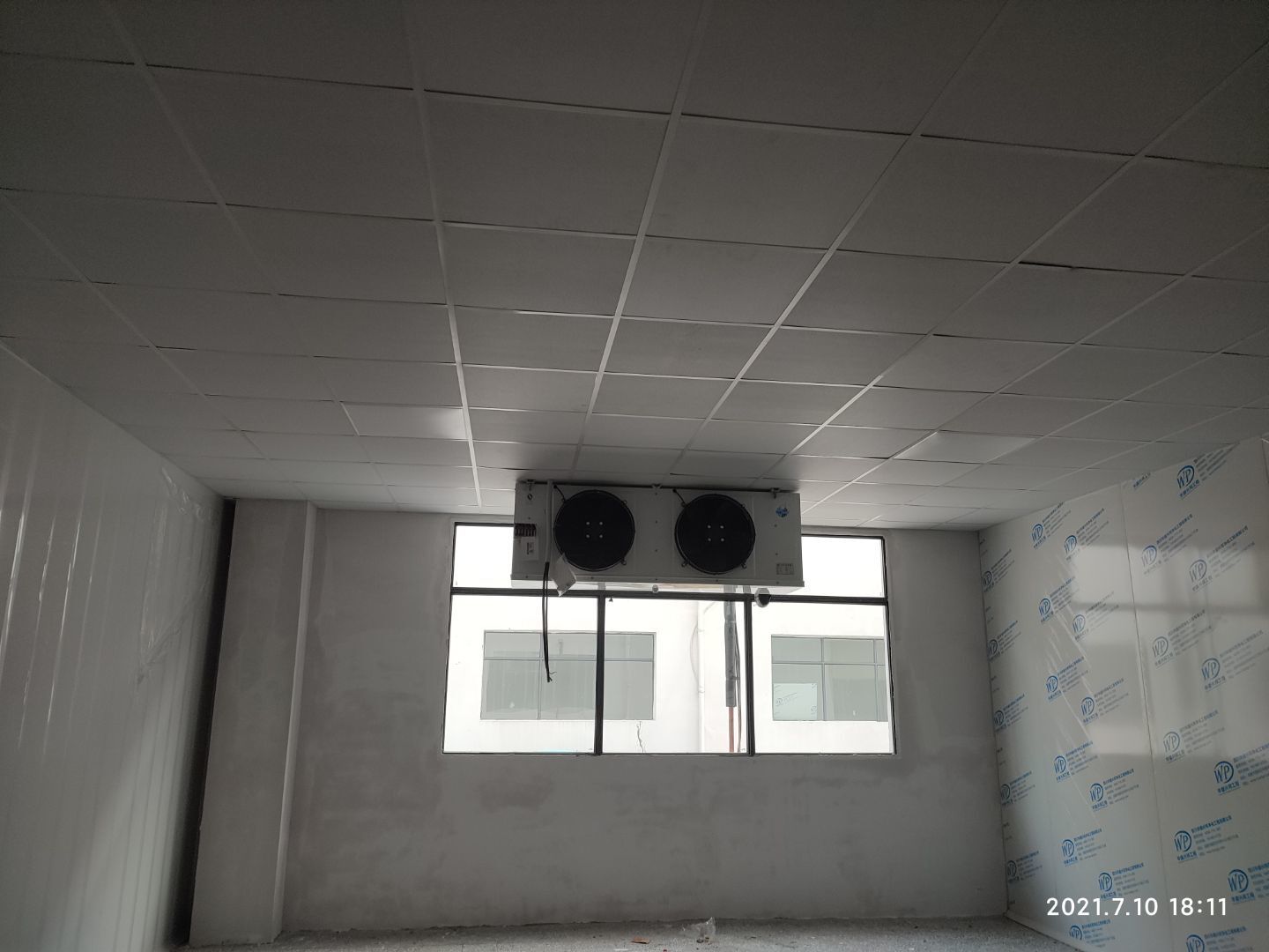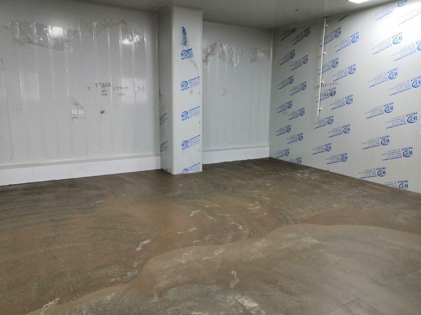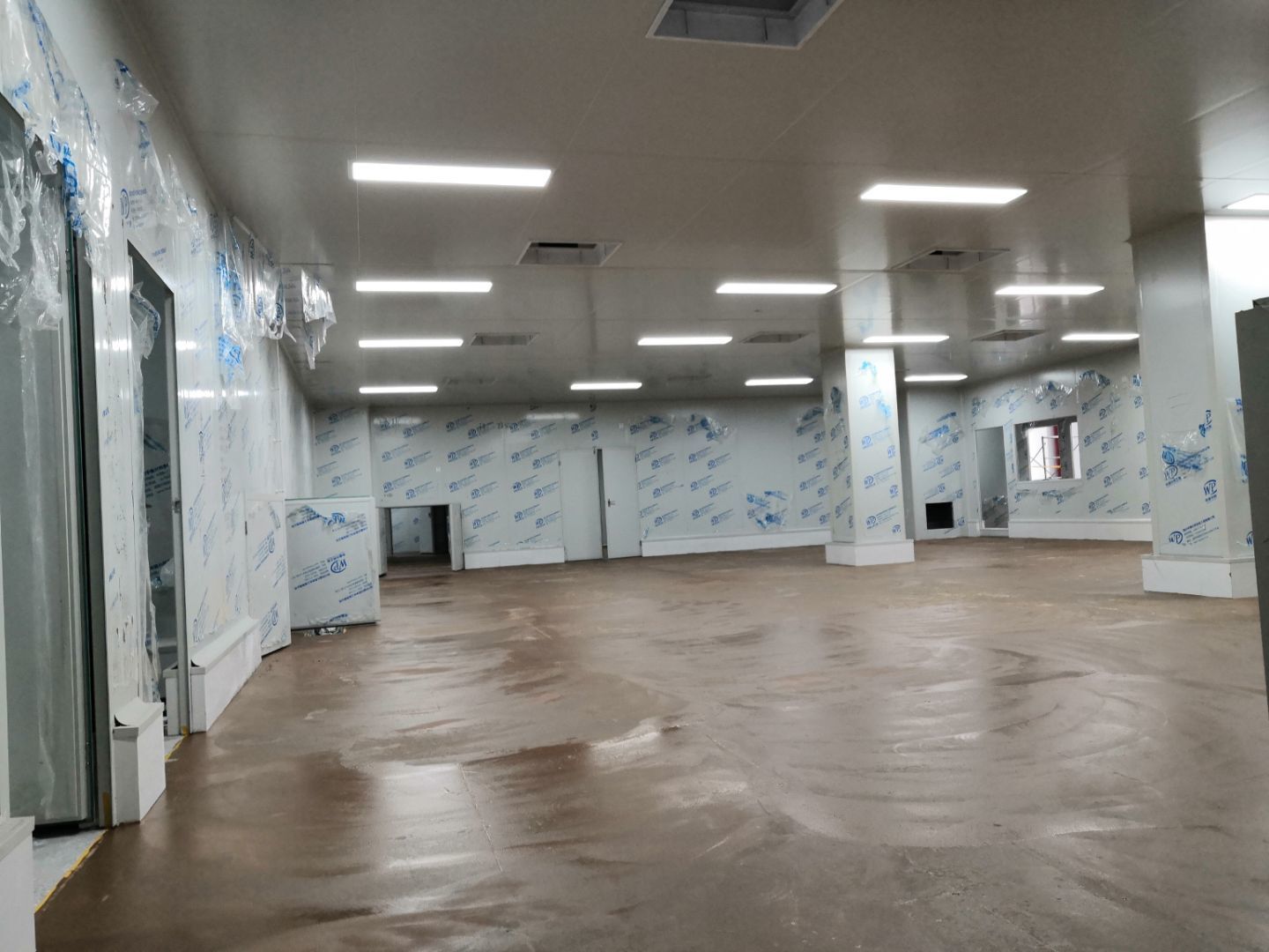 1.凍庫空調(diào)銅管焊接和保溫,控制線安裝完成,保壓完成,冷凝水管完成。 3.瓷磚鋪貼完成90%; 4.刮墻面頭道膩子完成75%