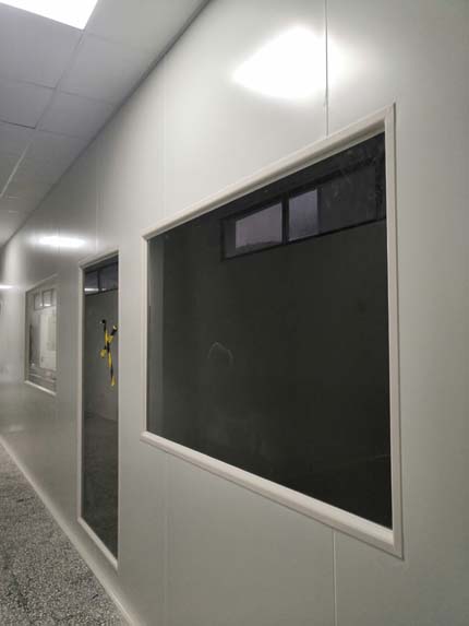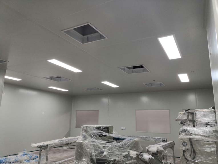1.彩鋼板頂板完成65% 2.電氣穿管布線完成35%,燈具安裝完成30% 3.圓弧完成15% 4.高效送風口開洞完成50%