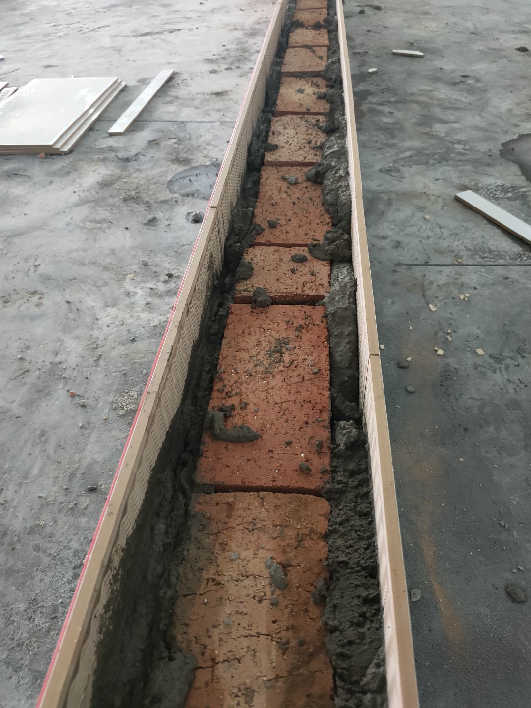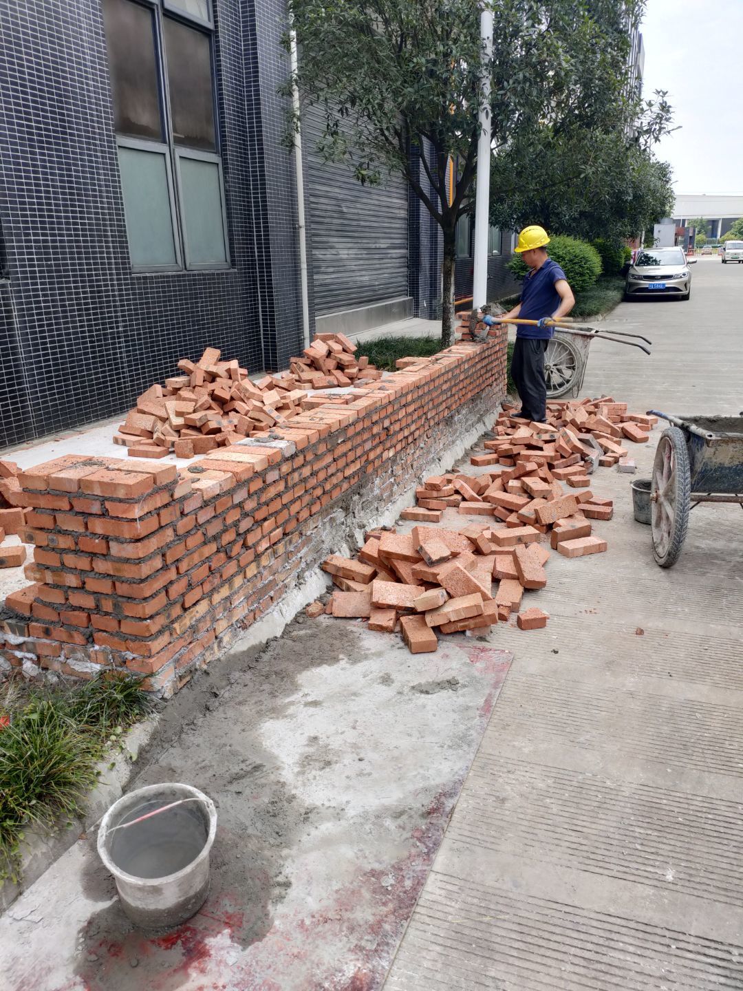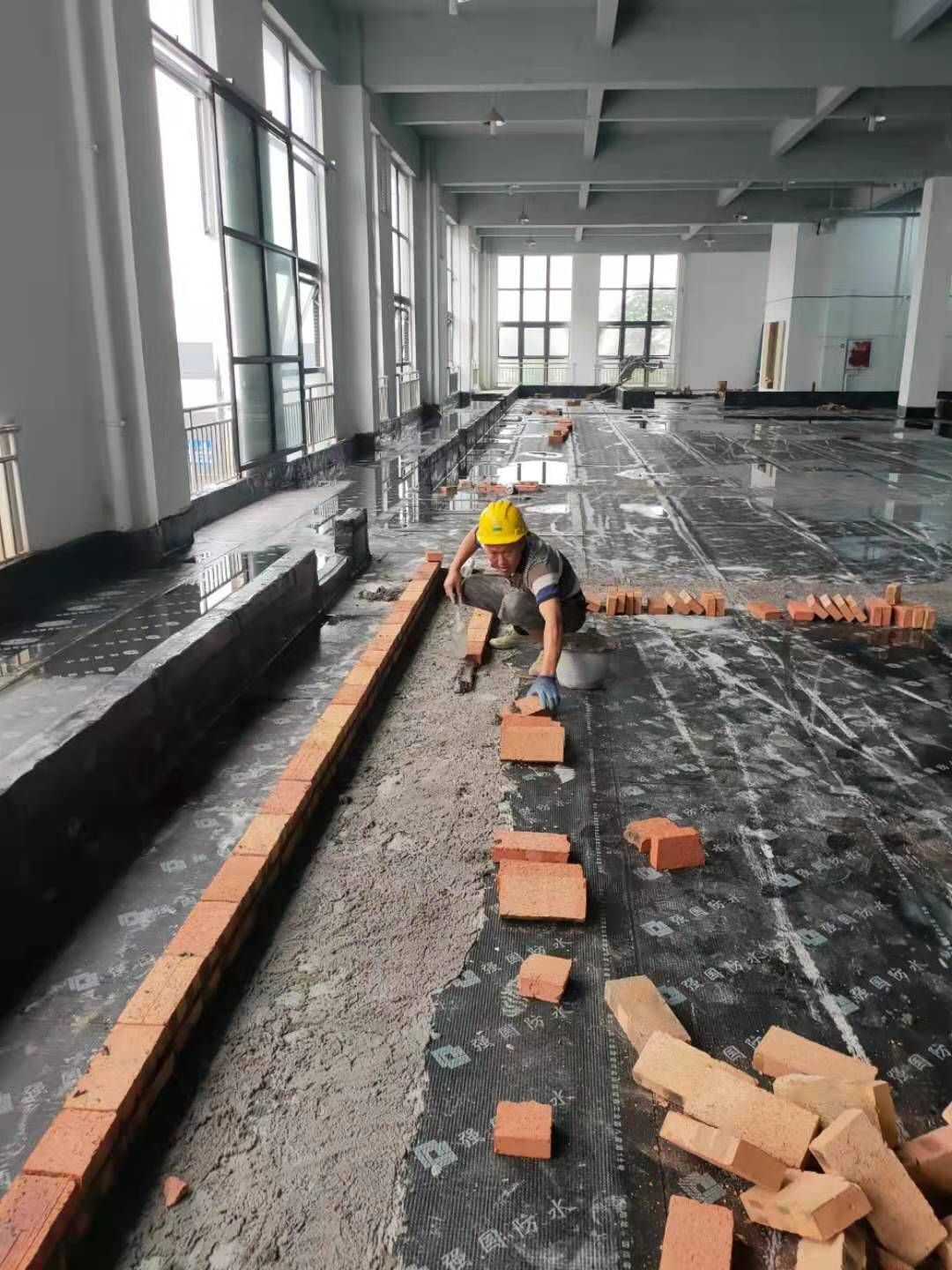 材料上樓,擋水墻砌筑