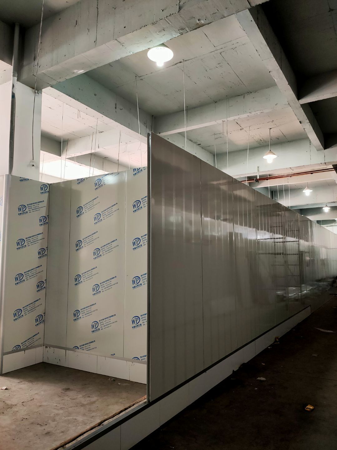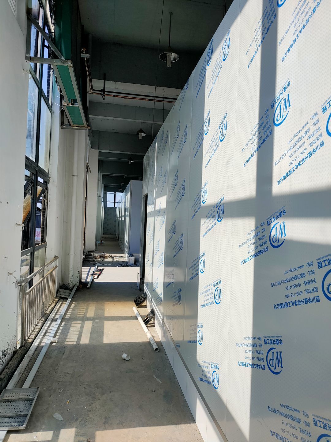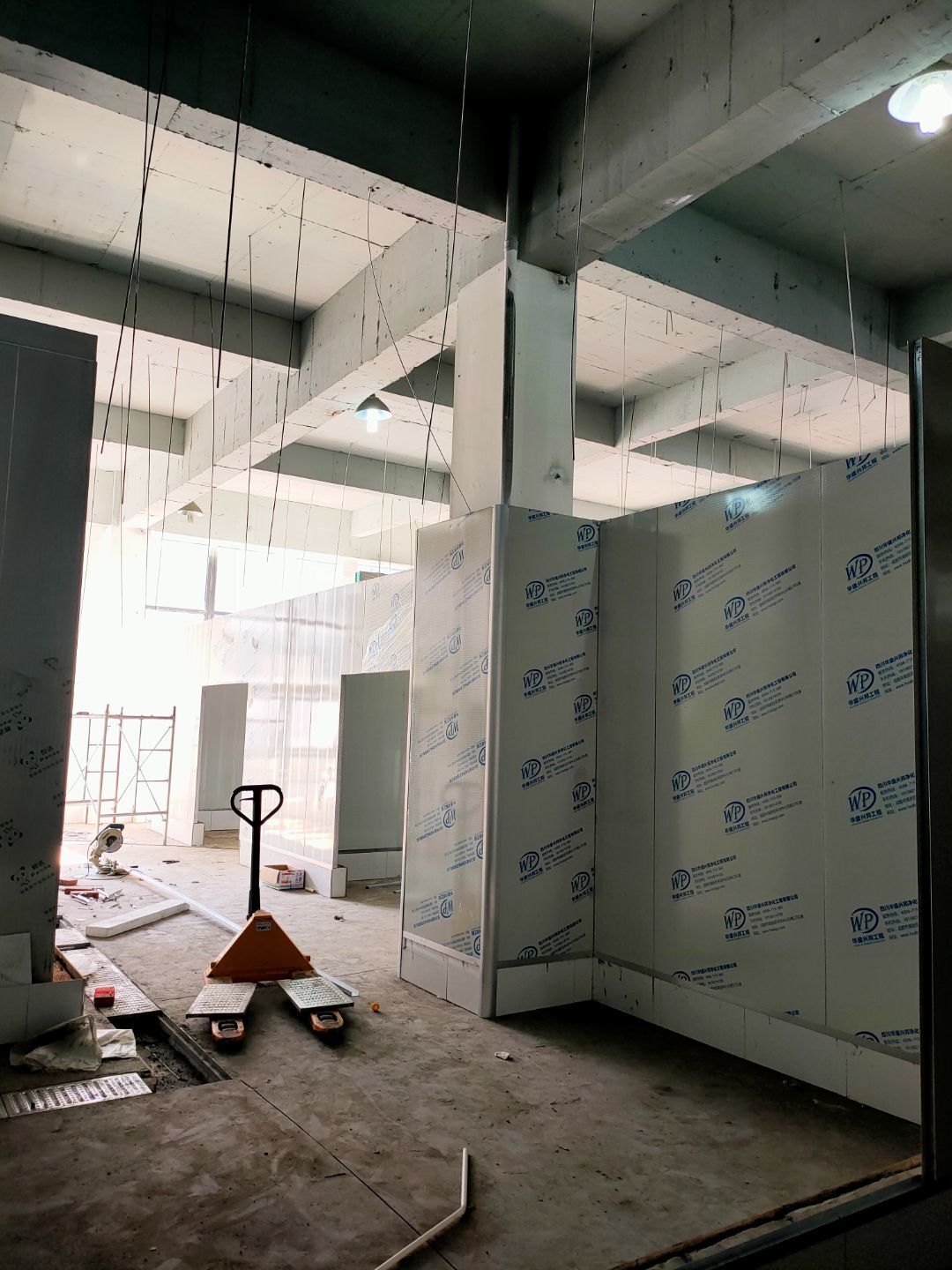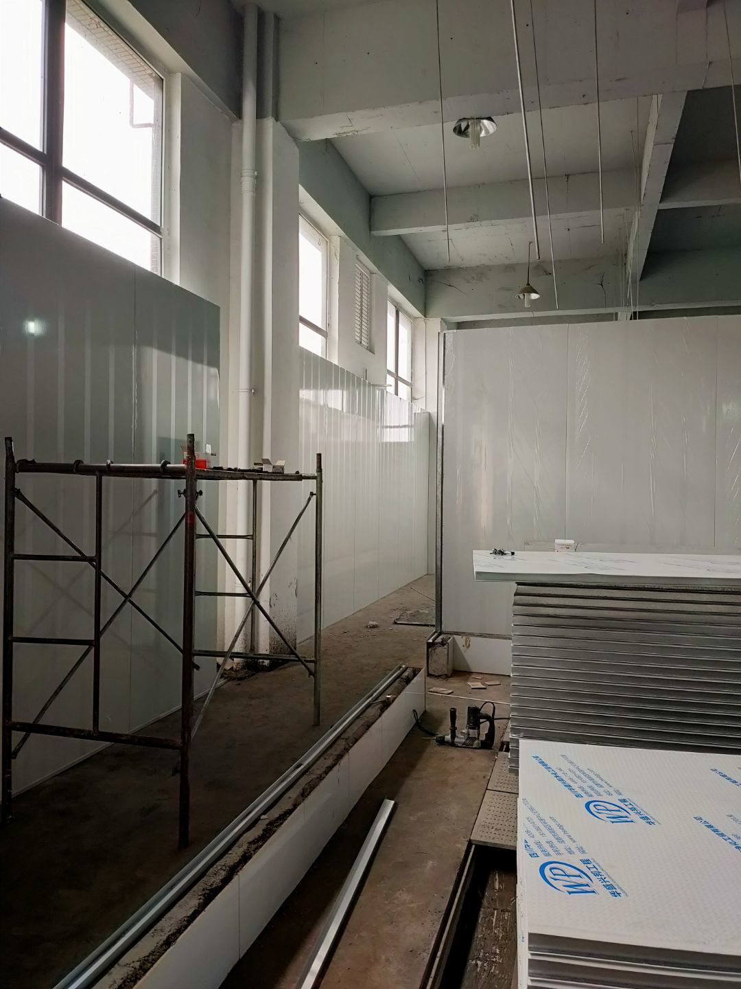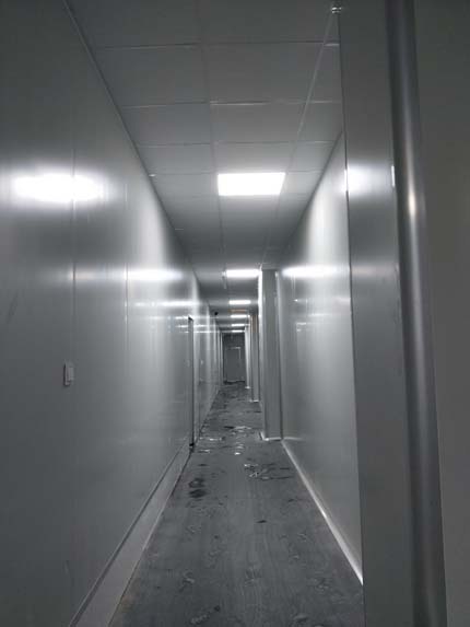 1、彩鋼主體完成100%; 2、圓弧門窗密封工程等完成100%; 3、水電完成45%; 4、三防板吊頂完成100%; 5、新增10公分玻鎂巖棉板完成100%; 6、動力電材料到場; 7、現場衛生打掃