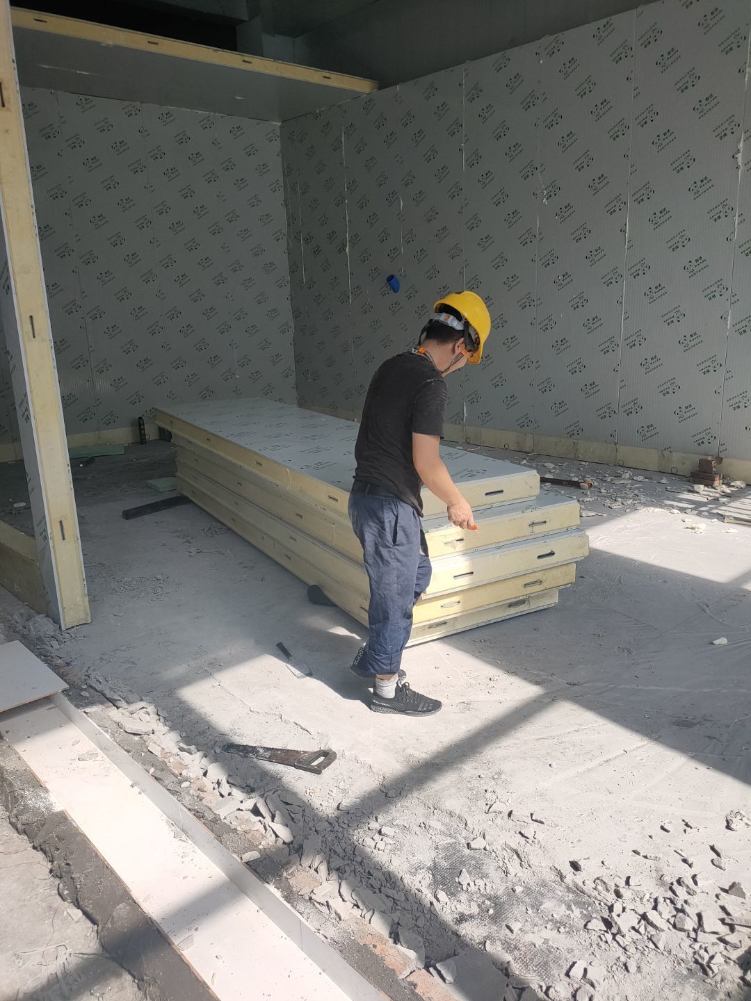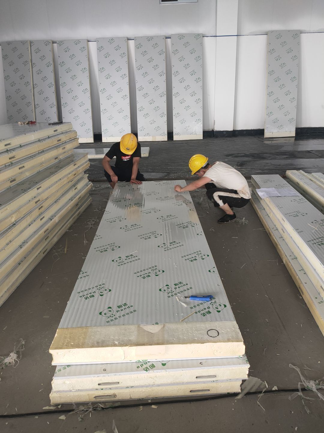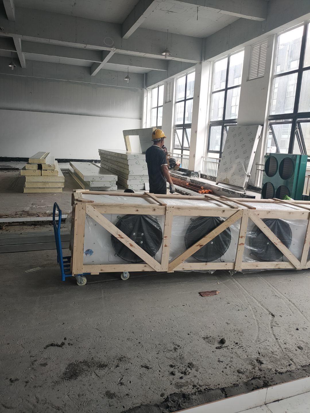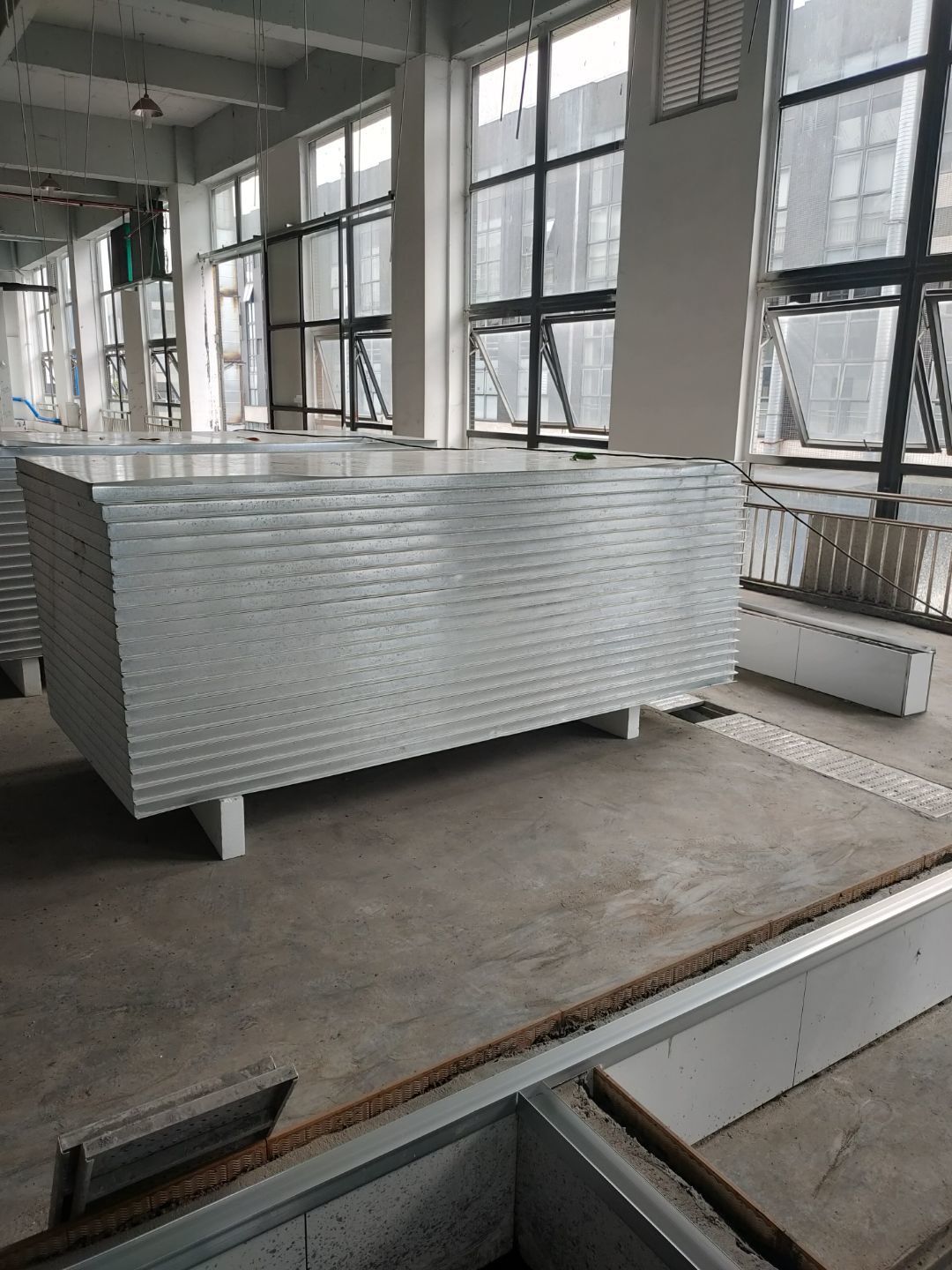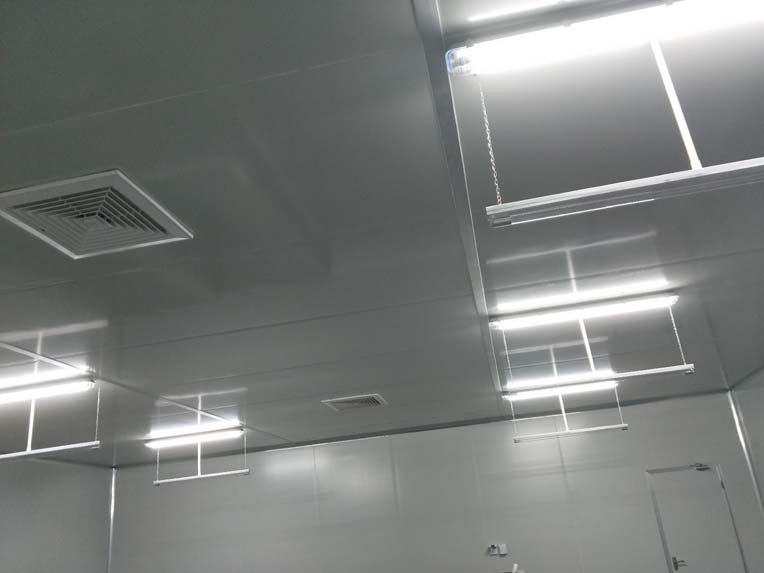 1、彩鋼主體完成100%; 2、圓弧門窗密封工程等完成100%; 3、水電完成45%; 4、三防板吊頂完成100%; 5、新增10公分玻鎂巖棉板完成100%; 6、動力電材料到場; 7、現場衛生打掃
