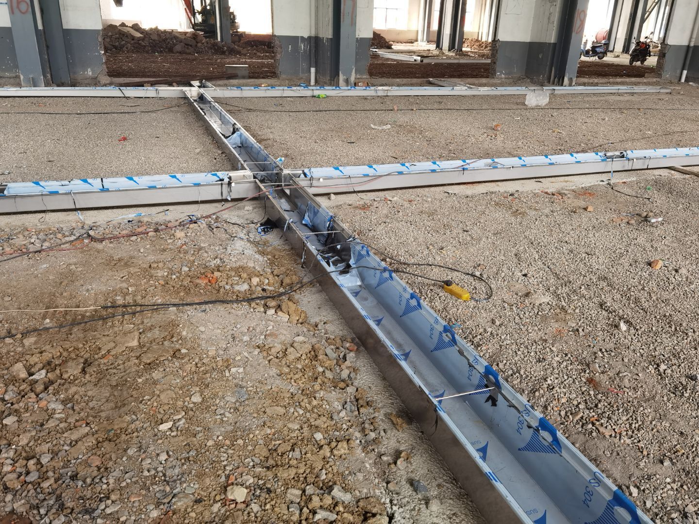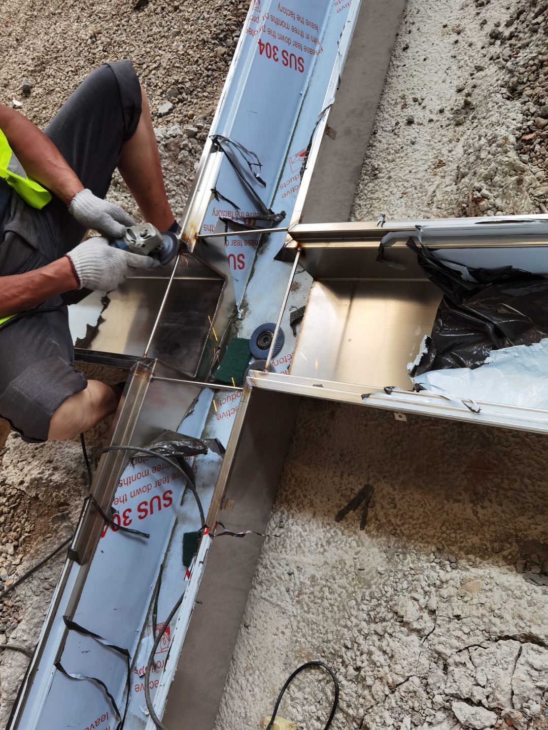 1,場地 整平 2,鋼構施工 3,不銹鋼排水溝安裝 4,不銹鋼水溝第二批到場 焊接 5,pvc排水管安裝 6,室外電纜管安裝 今日材料進場 不銹鋼排水溝材料