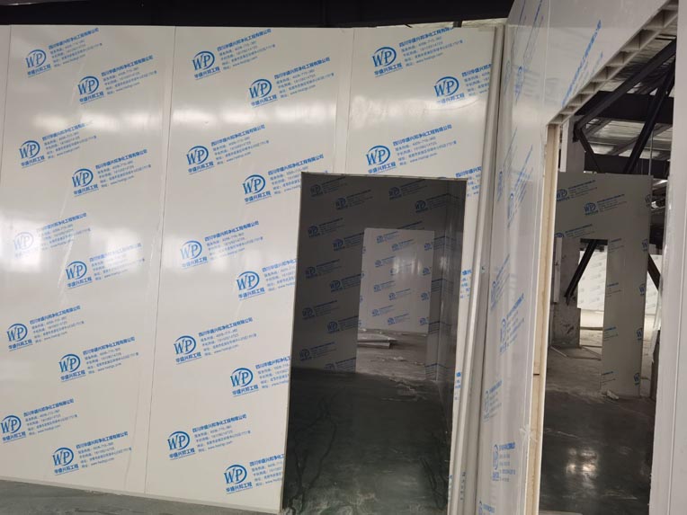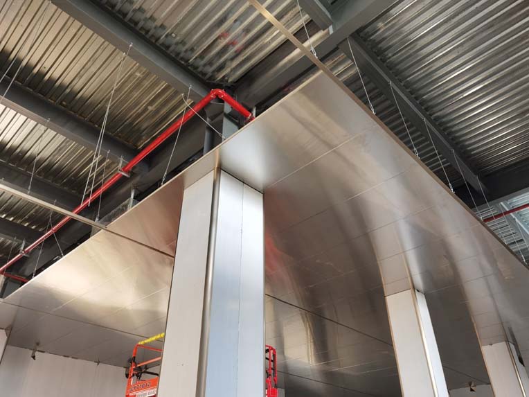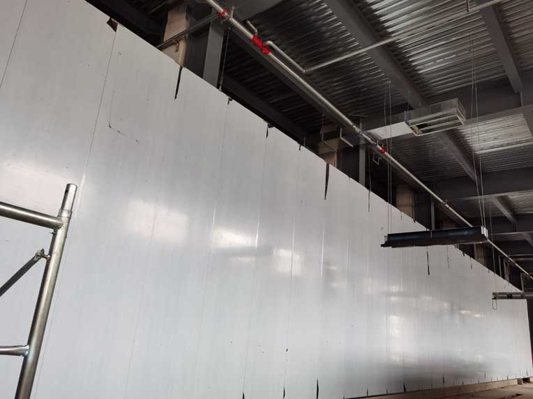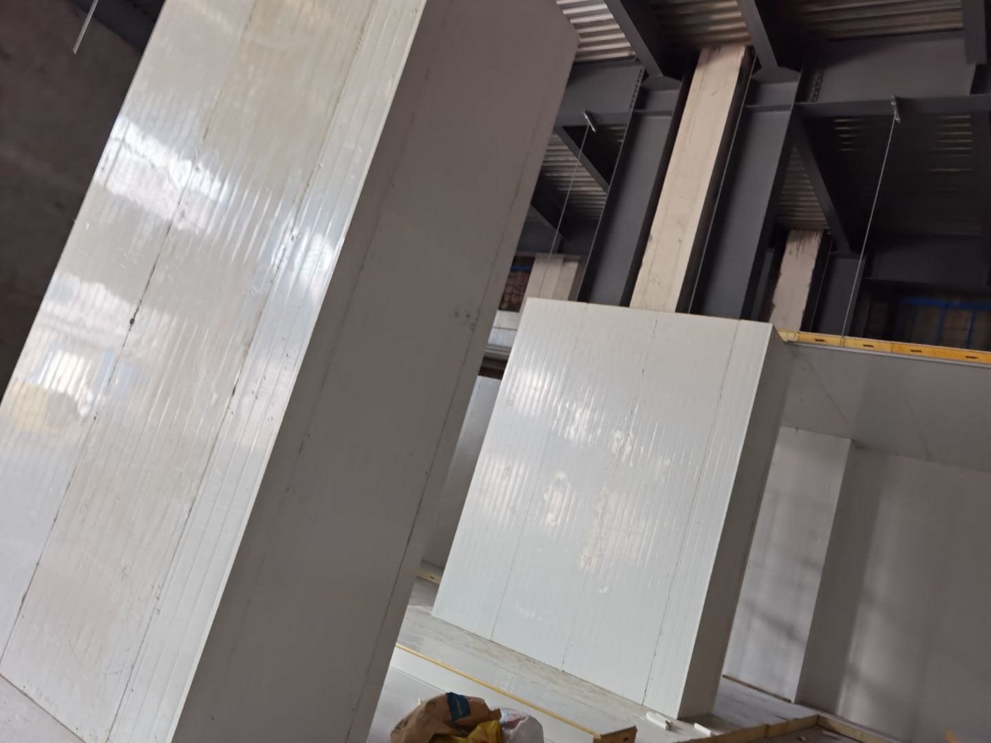 今日施工內容 1,彩板拍圓弧 打膠 2, 二層鋁扣板安裝 3,二層風管軟接 4,一層地坪施工 5,凍庫冷媒管安裝 6,二層墻板安裝 7,一層消防煙感安裝 8,蒸汽管道施工 9,門體安裝 今日材料進場 彩板 消防主水管 工藝設備