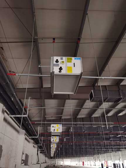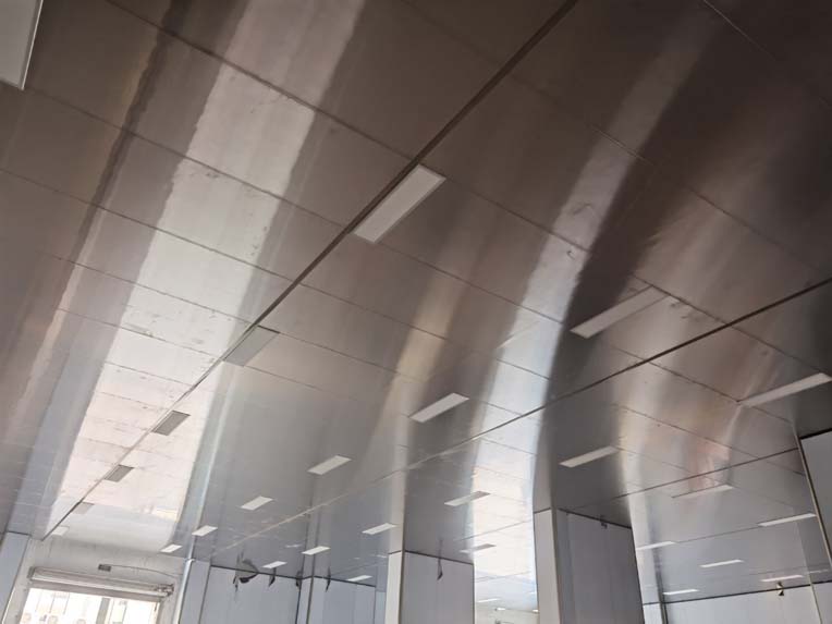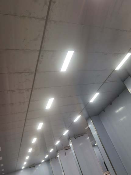 今日施工內容 1,一二層彩板墻頂板安裝 2, 彩板打膠 拍圓弧 3,一層地坪施工 4,二層空調回風箱安裝 5,二層空調吊柜 盤管放線 6,電梯施工 7,樓梯貼磚 8,鋁扣板絲桿吊裝