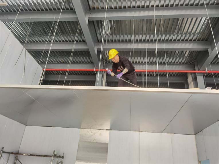 今日施工內容: 1,彩板頂板安裝 掛T鋁 2,室外門衛安抹灰 3,二樓動力電橋架支架開始施工 4,室外消防水箱安裝 5,土建擋水墻斜抹灰 修補 6,二樓消防噴淋施工 7,室外外墻噴真石漆