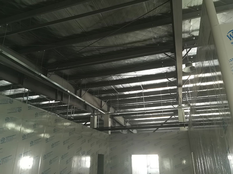 1,一樓地槽 彩板 吊筋安裝 2,一樓鋼構頂刷漆 3,一層鋼構平臺施工 4,西邊室外雨水管安裝 5,一樓凍庫門體安裝 6,一樓空調風管吊裝 7,二樓空調柜機吊裝 8,電梯施工