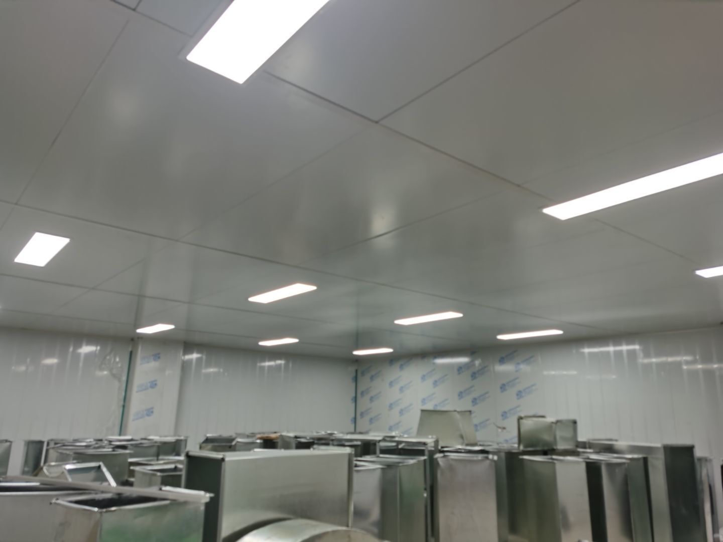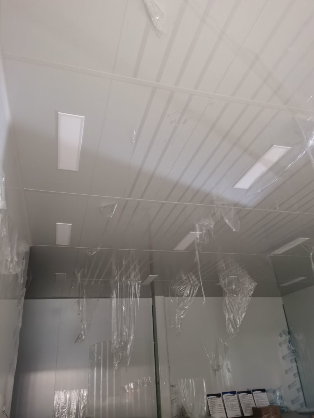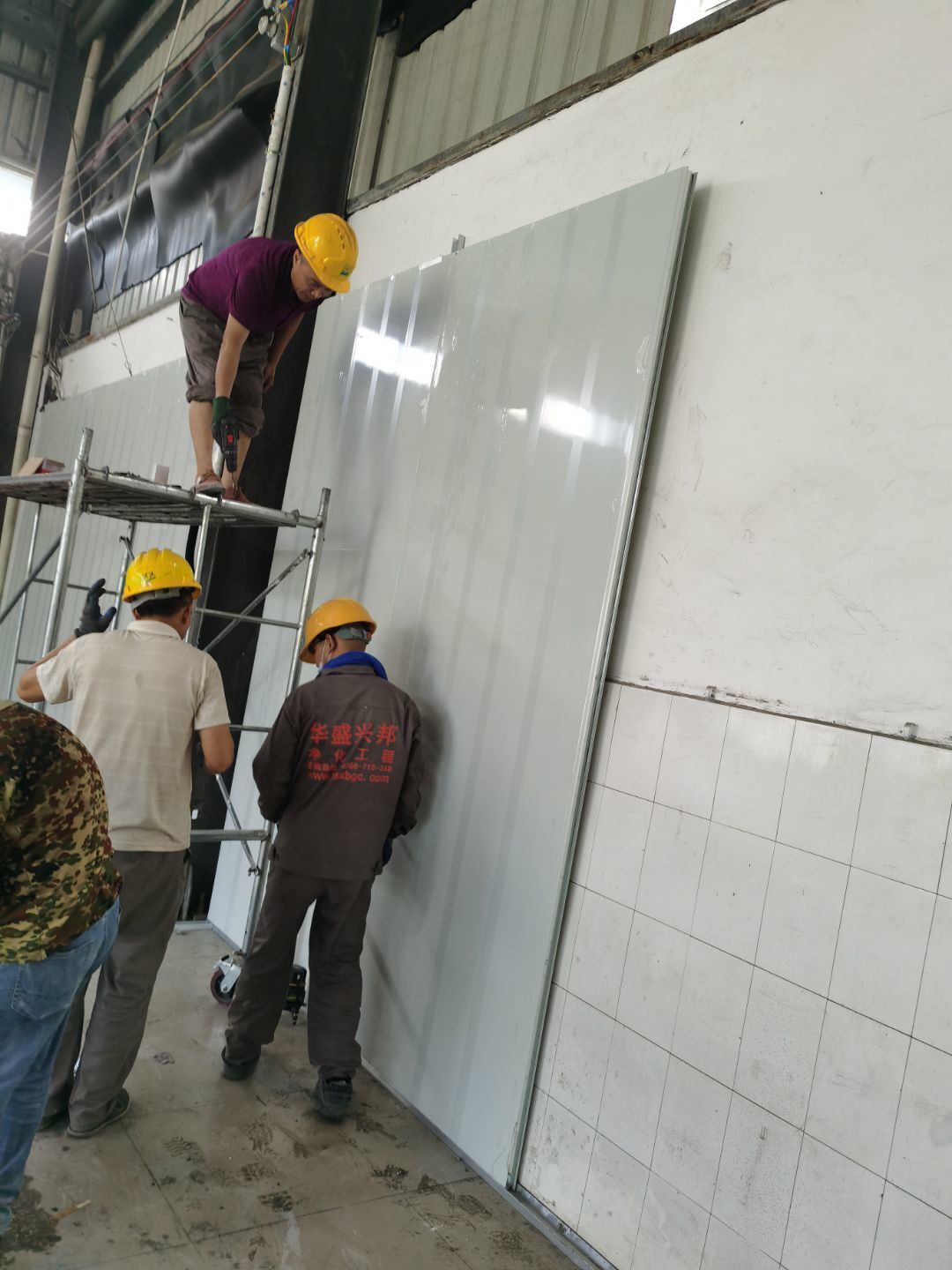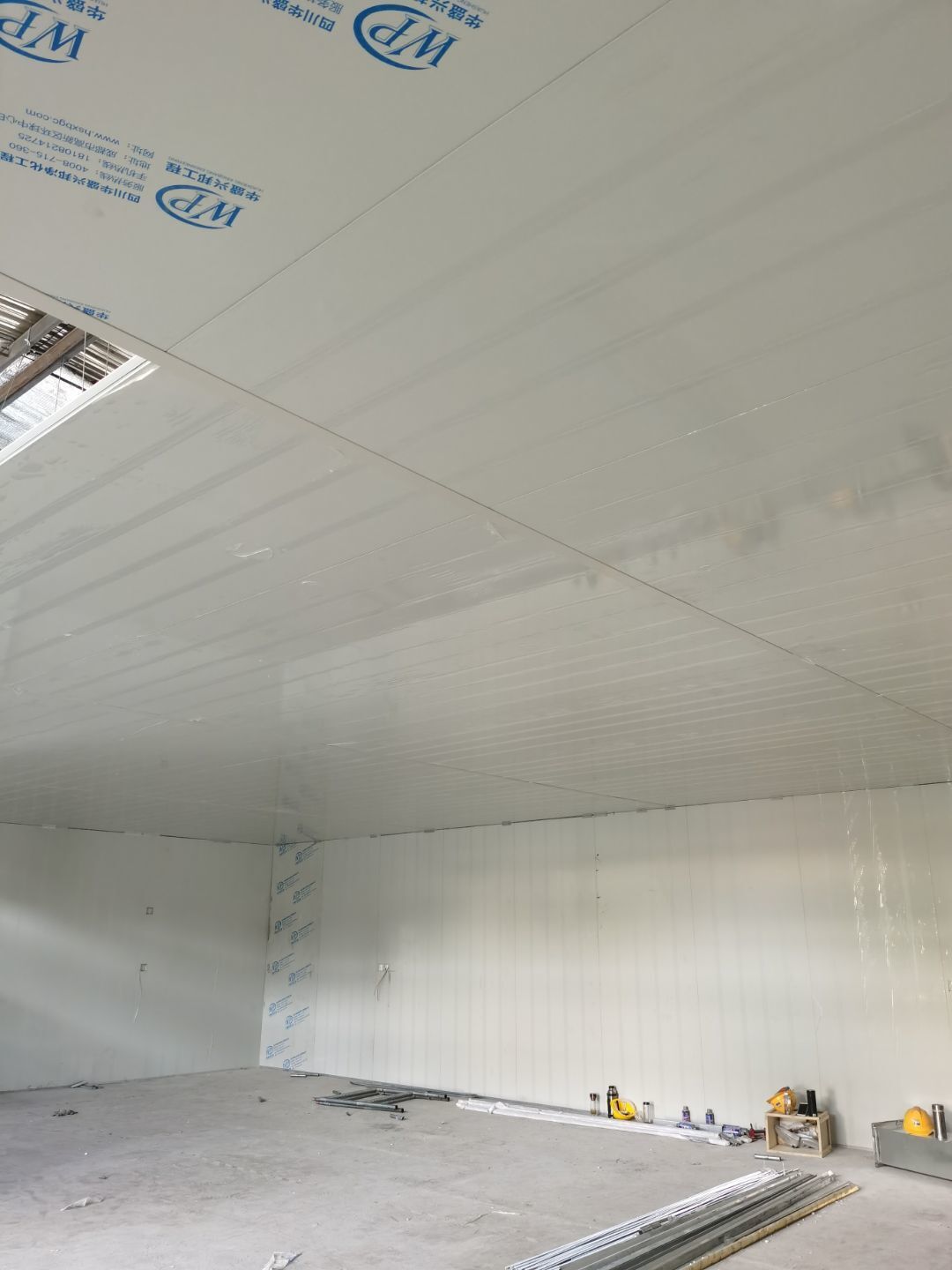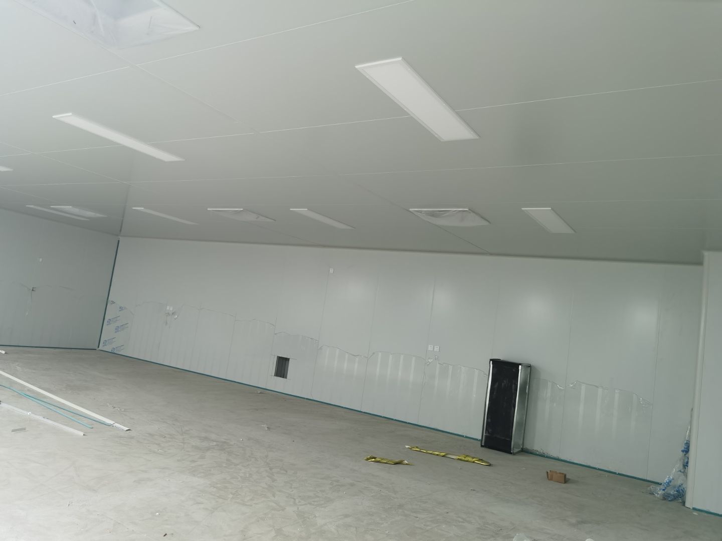 1,彩鋼墻板立板除預留設備外完成100% 2,彩鋼板吊頂除預留外,完成95% 3,三防板吊頂完成100% 4,水電安裝完成60% 5,彩鋼板收尾工作完成50%