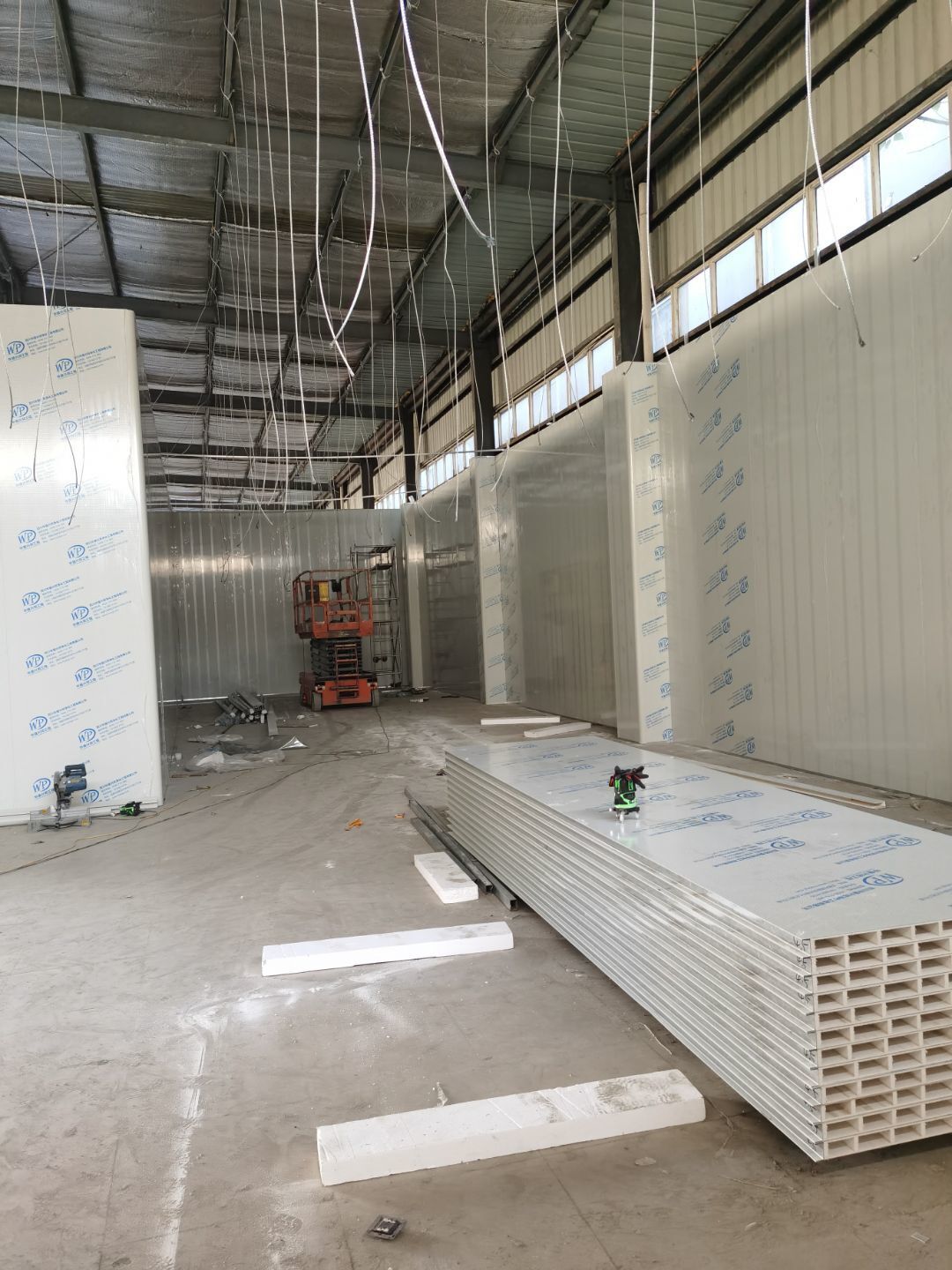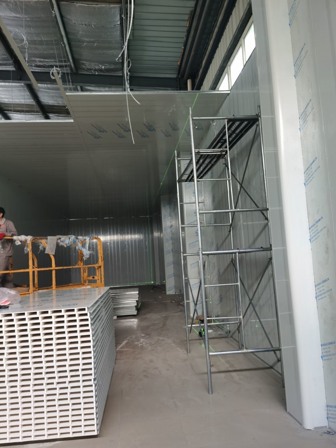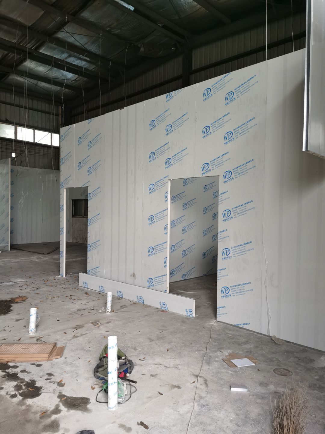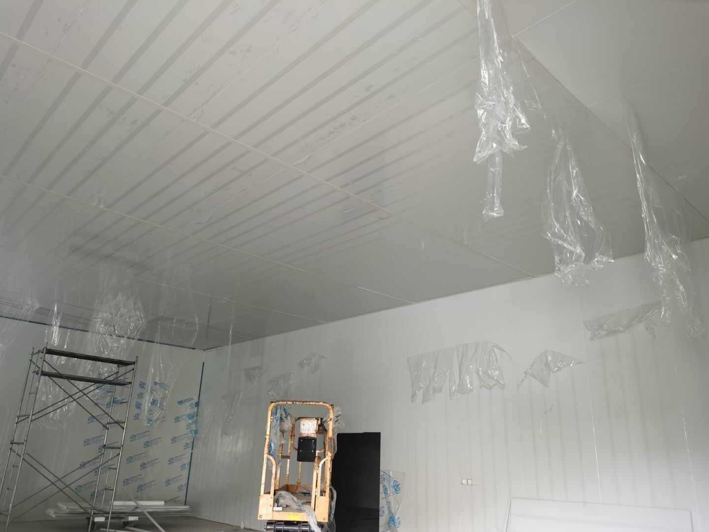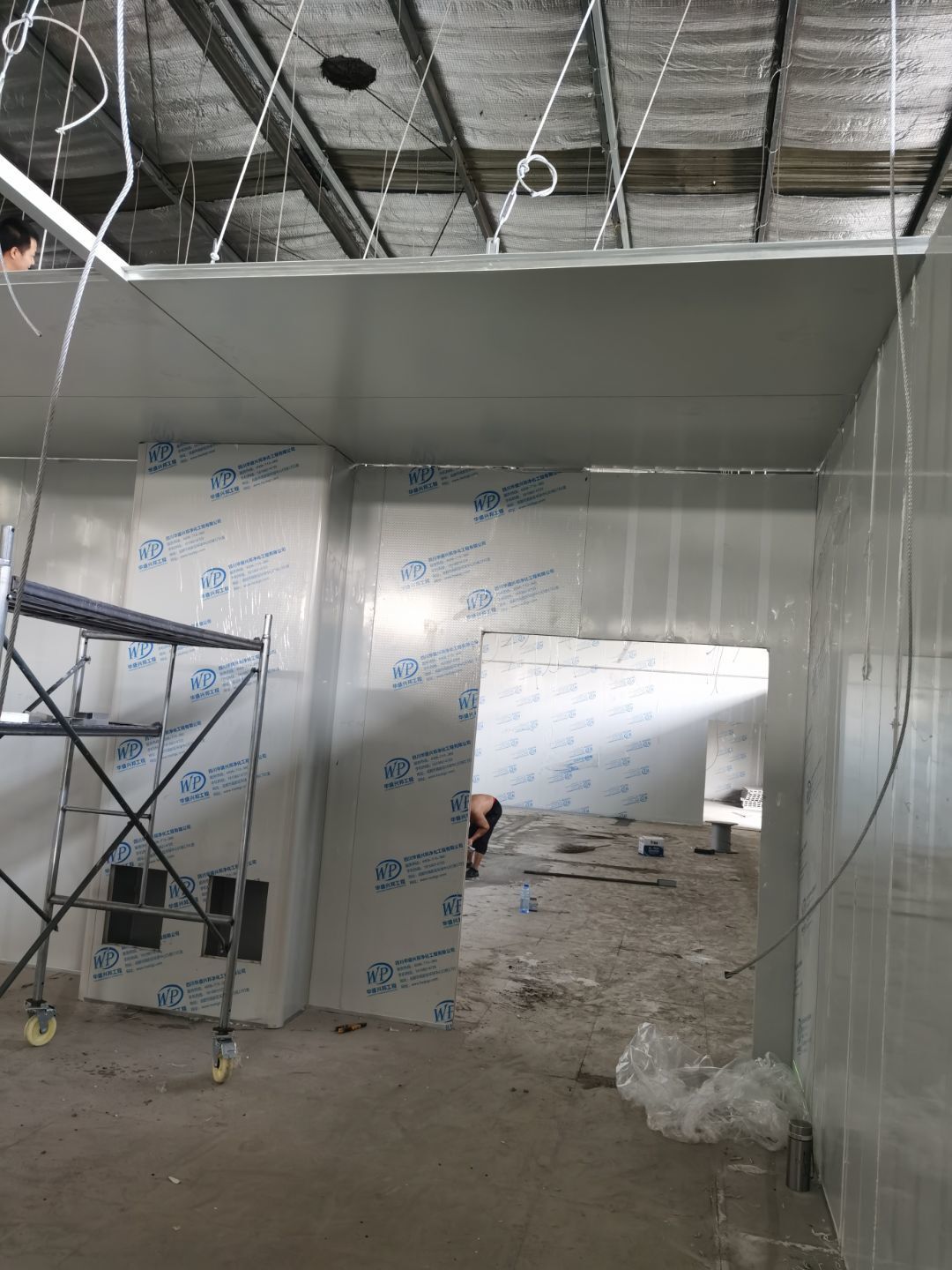 1,彩鋼墻板立板除預留設備外完成100% 2,彩鋼板吊頂除預留外,完成95% 3,三防板吊頂完成100% 4,水電安裝完成60% 5,彩鋼板收尾工作完成50%