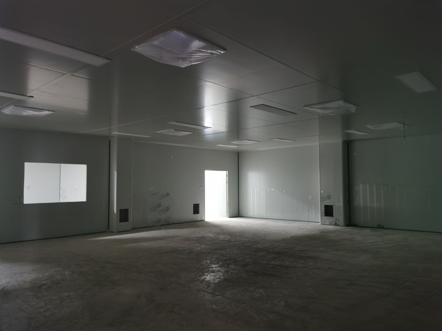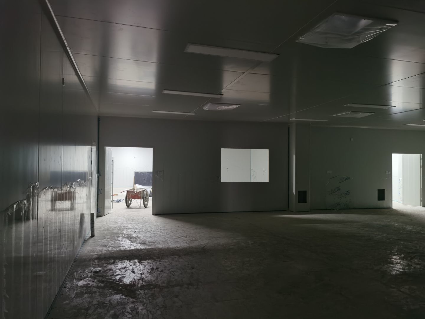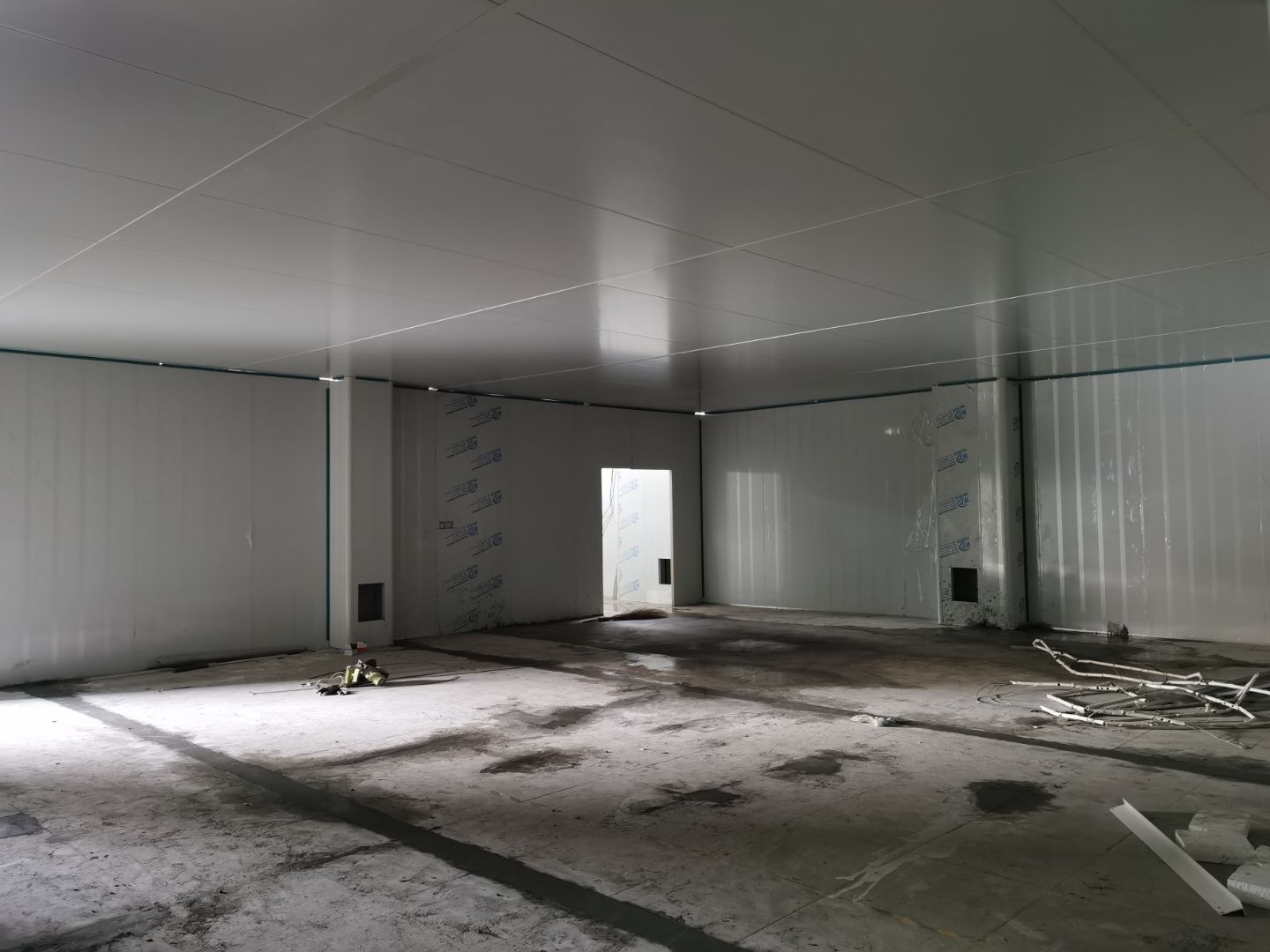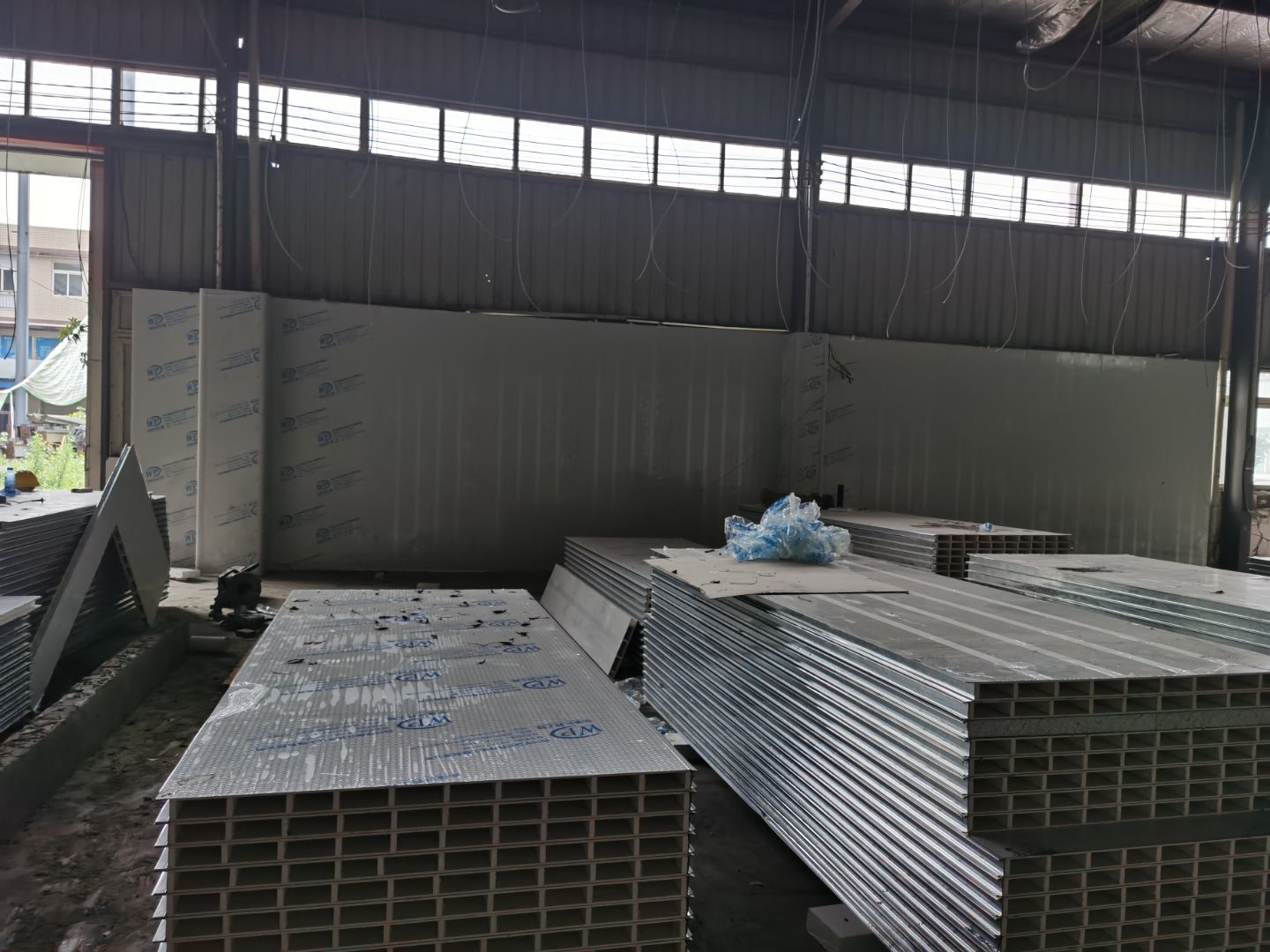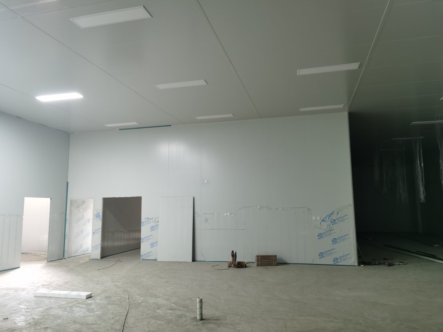 1,彩鋼墻板立板除預留設備外完成100% 2,彩鋼板吊頂除預留外,完成95% 3,三防板吊頂完成100% 4,水電安裝完成60% 5,彩鋼板收尾工作完成50%