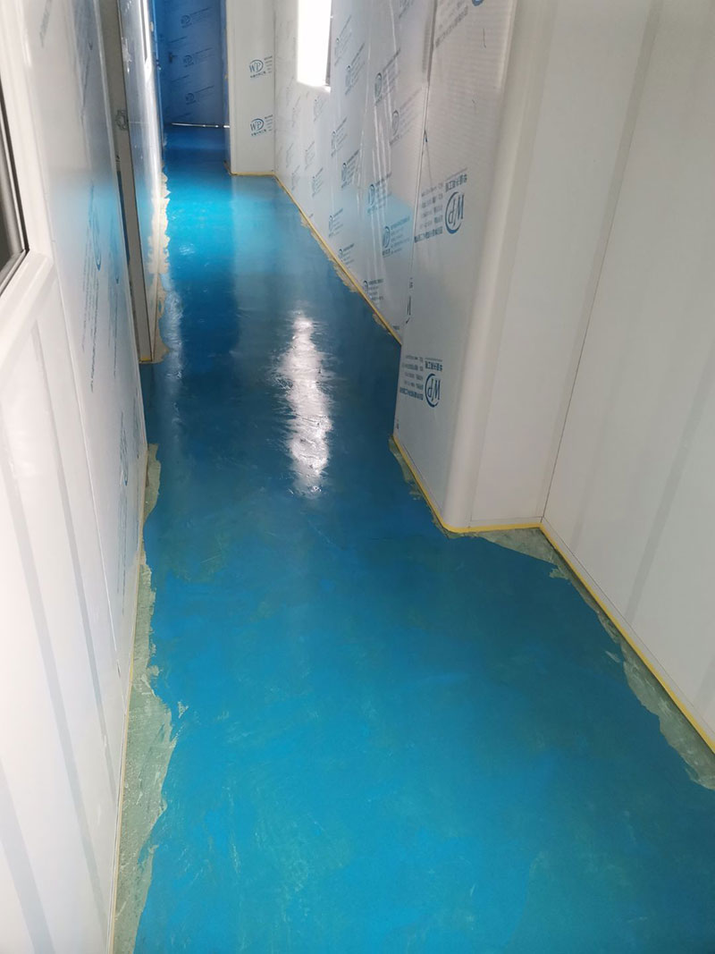 1.頂板安裝完成100%; 2.三防板吊頂完成100%; 3.水電安裝完成90%,燈具安裝完成95%; 4.新增動力電完成90%; 5.衛生間隔墻完成100%; 6.腳踏池完成100%; 7.風淋室制作完成90%; 8.地坪膩子層完成80%; 9.場地清理。