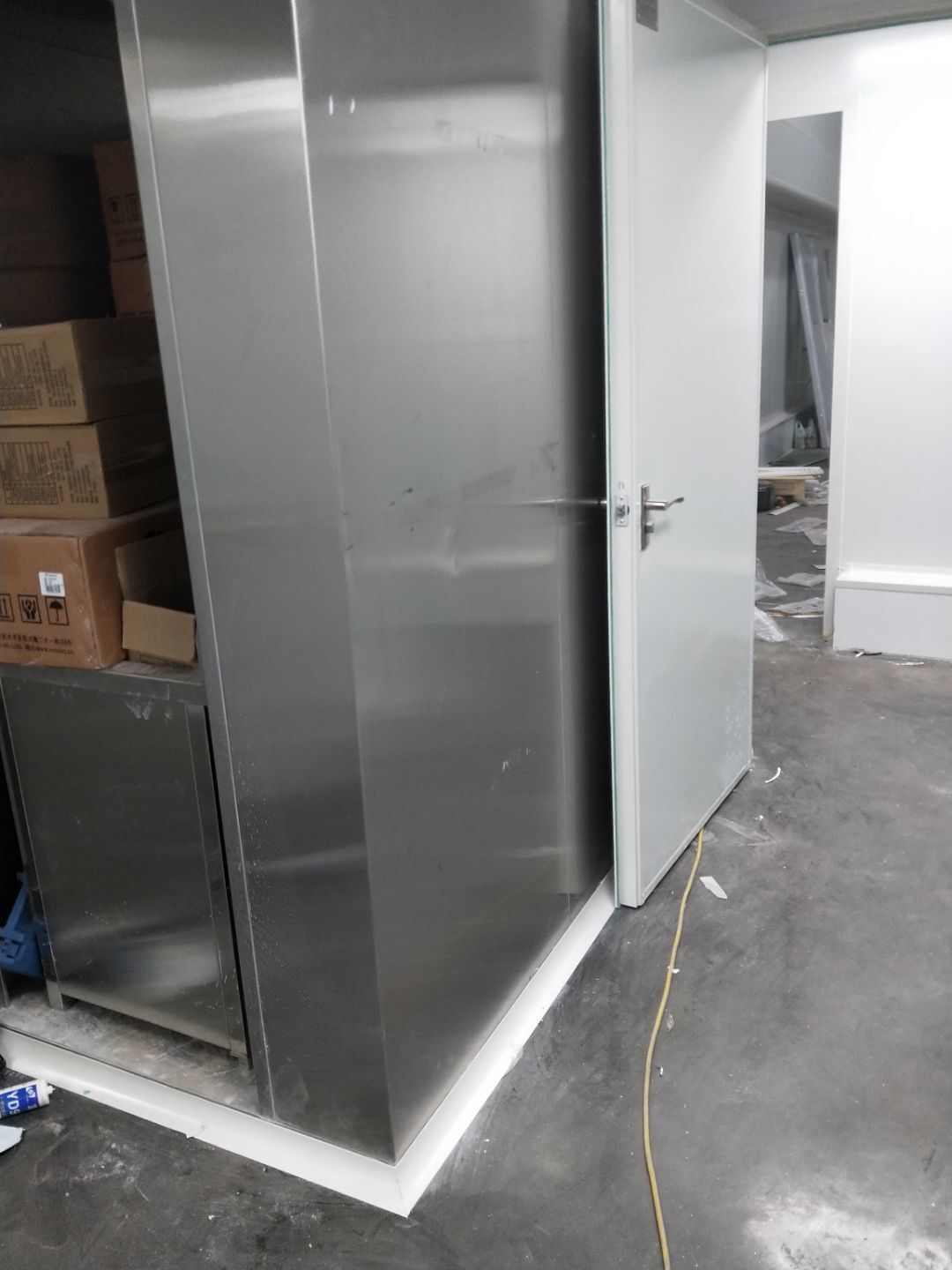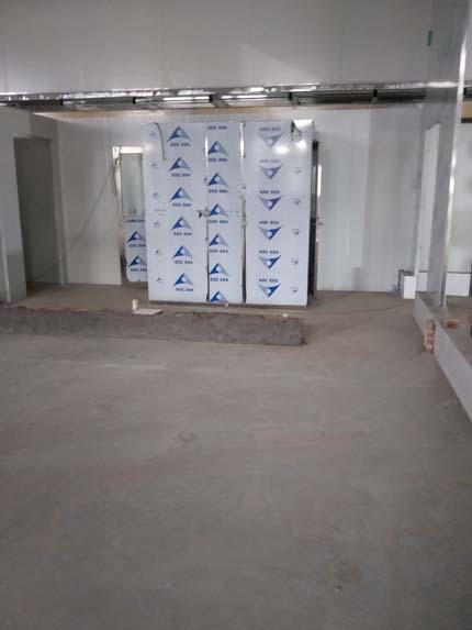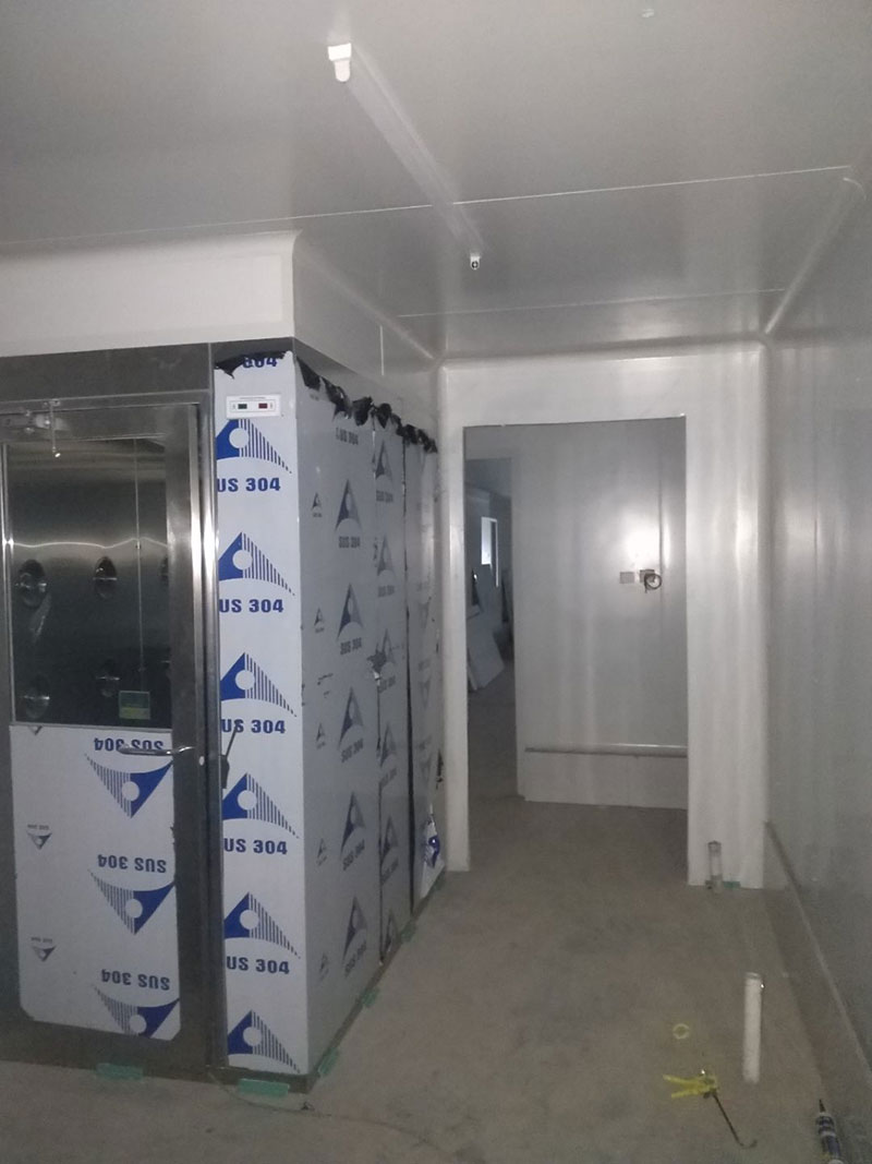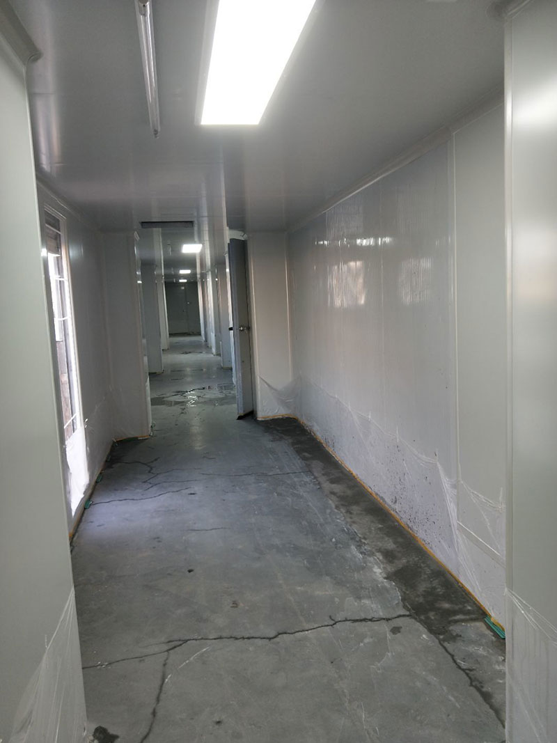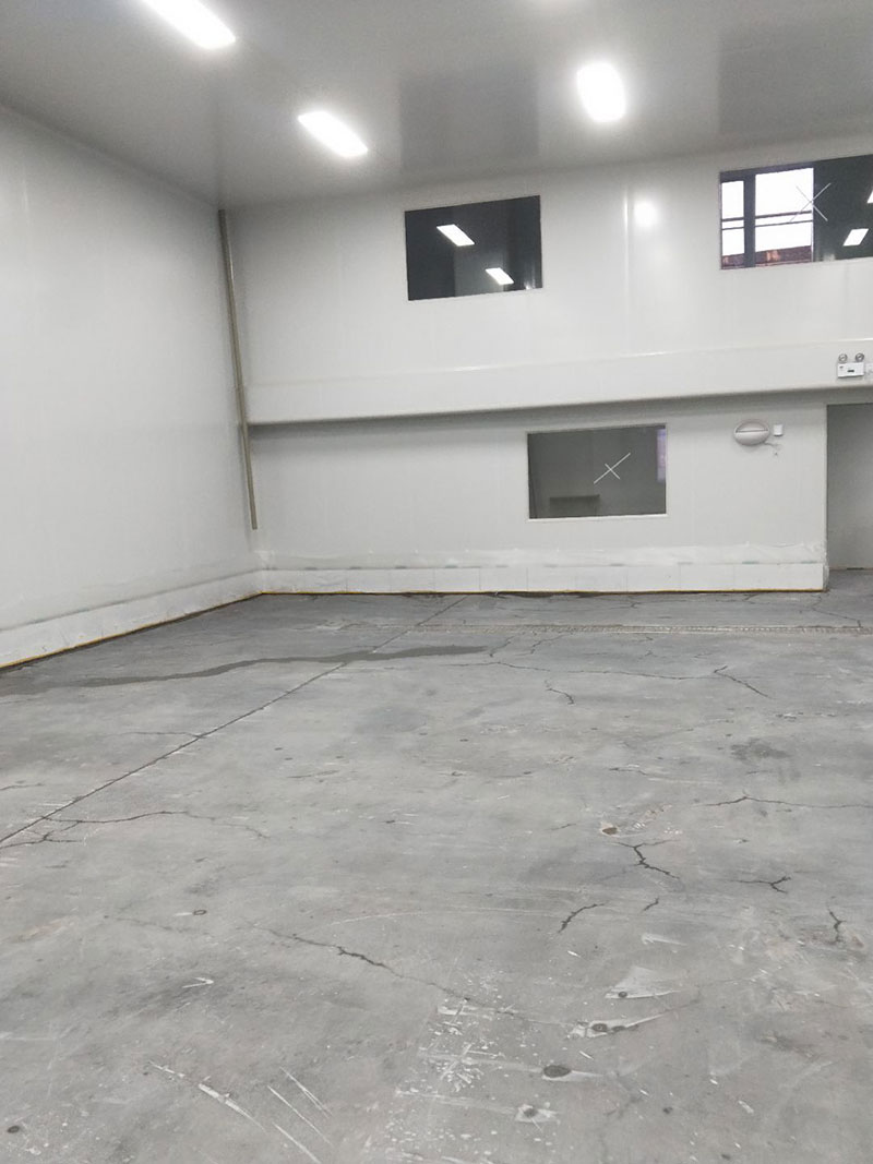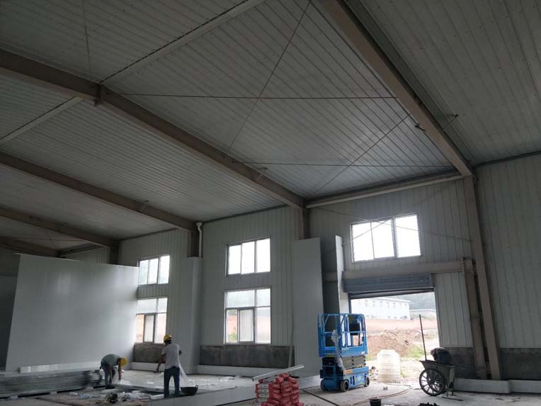 1:彩鋼墻板完成100% 2:彩鋼頂板完成100% 3:撕膜打膠完成100% 4:自制門窗完成100% 5:水電完成98% 6:圓弧完成95% 7:金剛砂完成100% 8:三防板吊頂完成100% 9:地面固化完成100% 10:動力電完成100% 11:空調安裝完成100% 12:聚氨酯地面完成100%