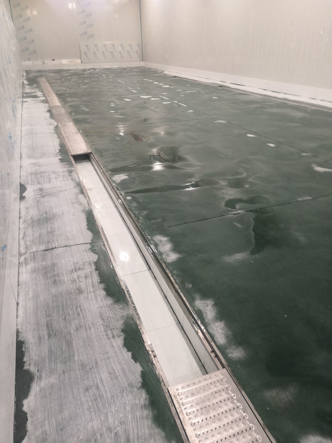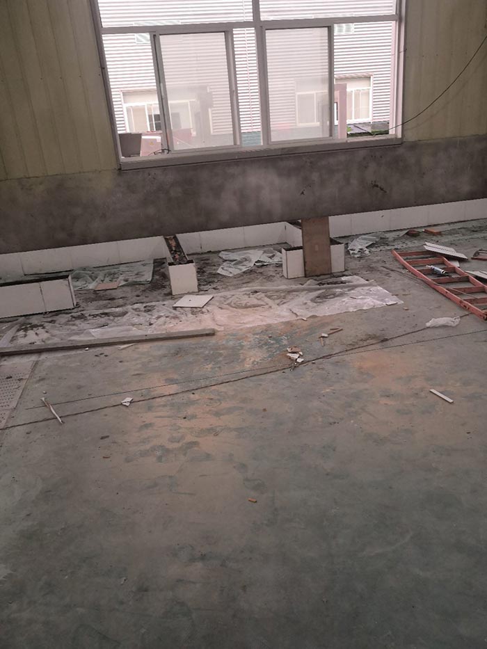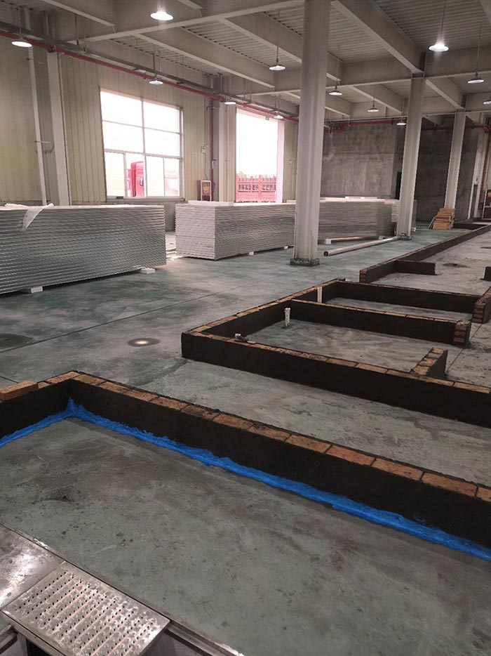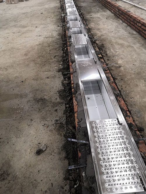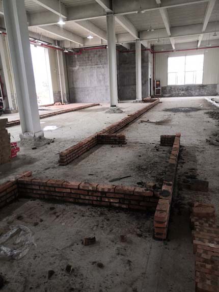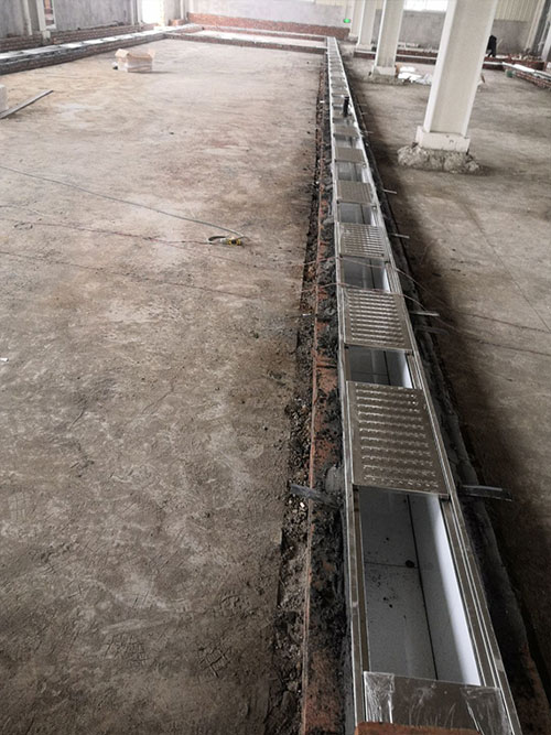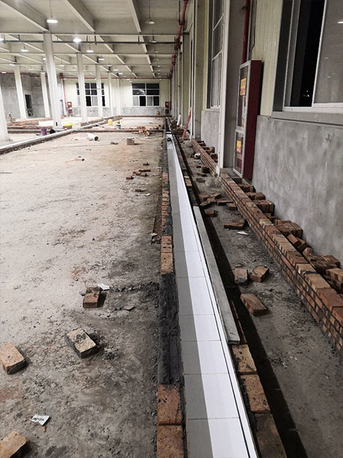 1.土建墻開門洞 2.不銹鋼溝邊條焊接加固 3.排水管不銹鋼溝邊條,不銹鋼蓋板安裝, 4.排水管貼瓷磚