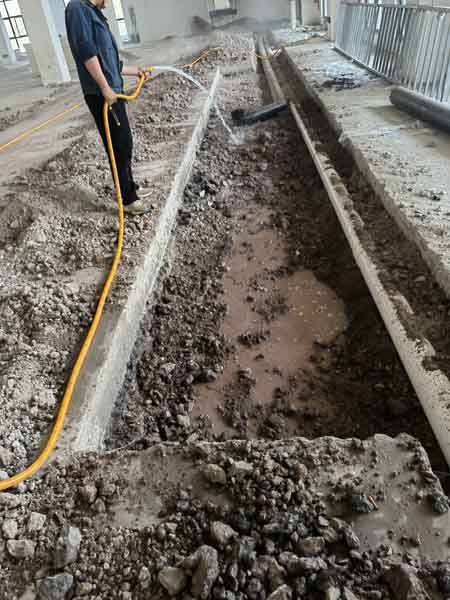 1,今日完成排水明溝及暗管溝放線工作。 2,今日完成擋水墻放線工作。 3,今日明溝及暗管溝切割已進場施工第1天
