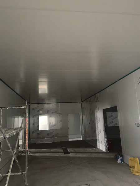1,凍庫內外砌磚已完成 2,排水明溝貼瓷磚施工第1天,完成分項施工40% 3,擋水墻砌墻施工第5天,完成分項工作100% 4,擋水墻貼瓷磚施工第4天,完成分項施工進度80% 5,彩鋼板立墻板施工第2天,完成分項施工進度10%